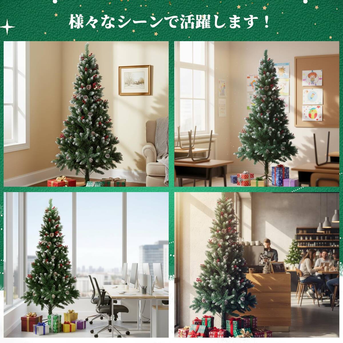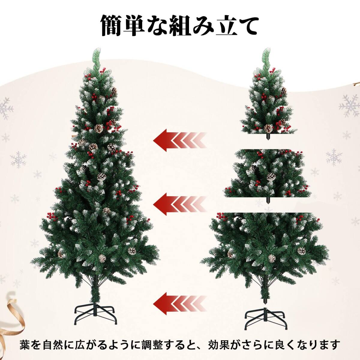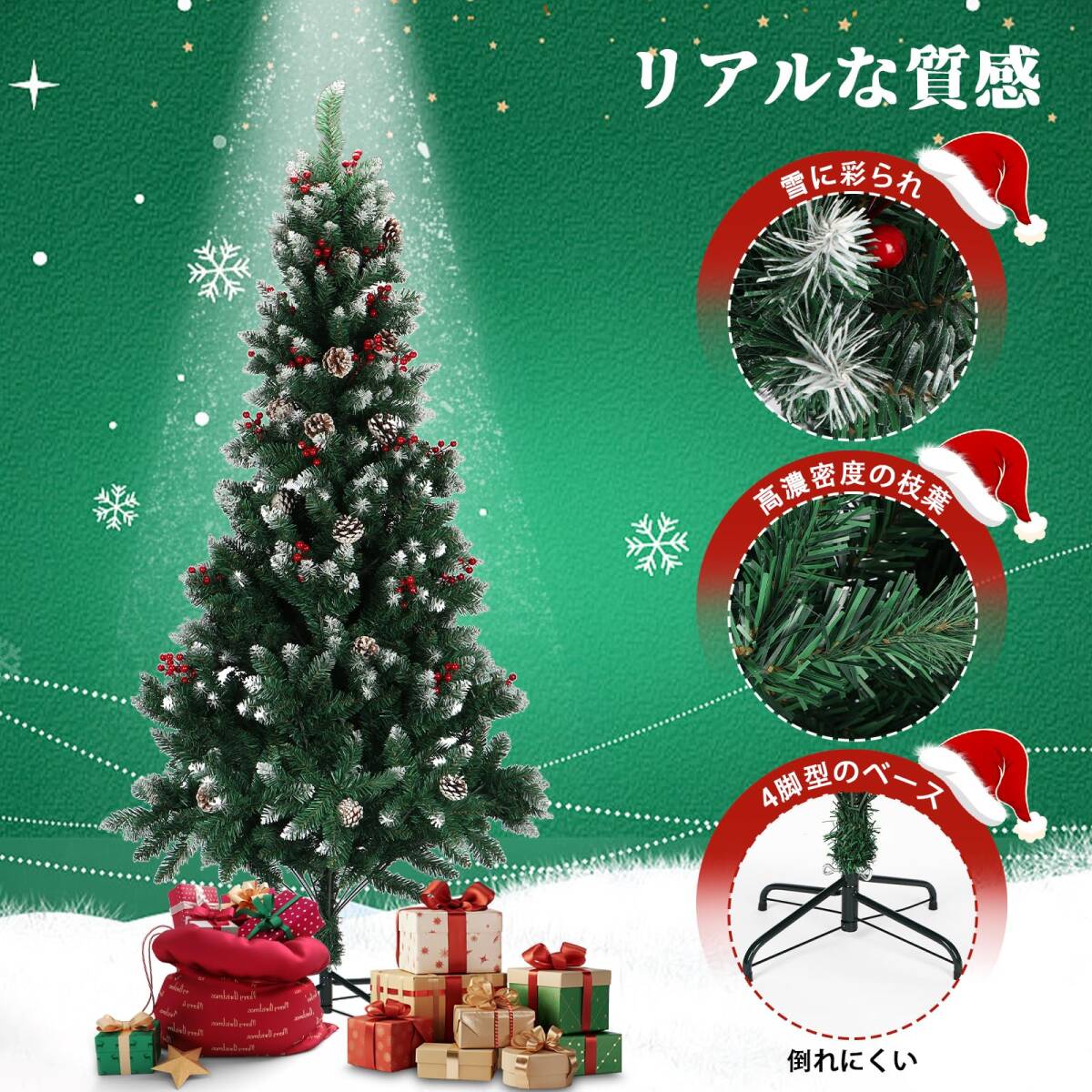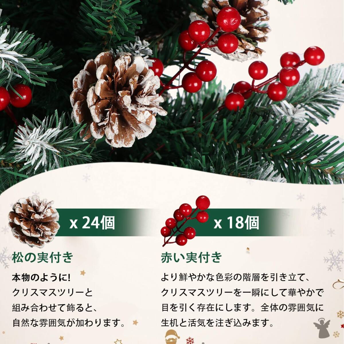 【リアルな質感と高濃密度】枝葉が密に配置された高品質ツリー。優れたPVC素材を使用して、本物の松の葉の色合いを再現します。自然な深緑色と雪に彩られ、赤い実と松の実の飾り付きで、豊かな生命力を表現します。本物のような質感と立体感で、上品な雰囲気を実現します。デコレーションの映え抜群です。