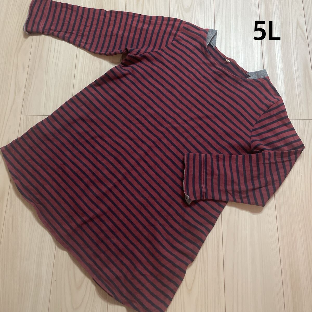 *イオン:サイズ5L:エンジ色のボーダー柄のロング丈Tシャツ:Aライン*