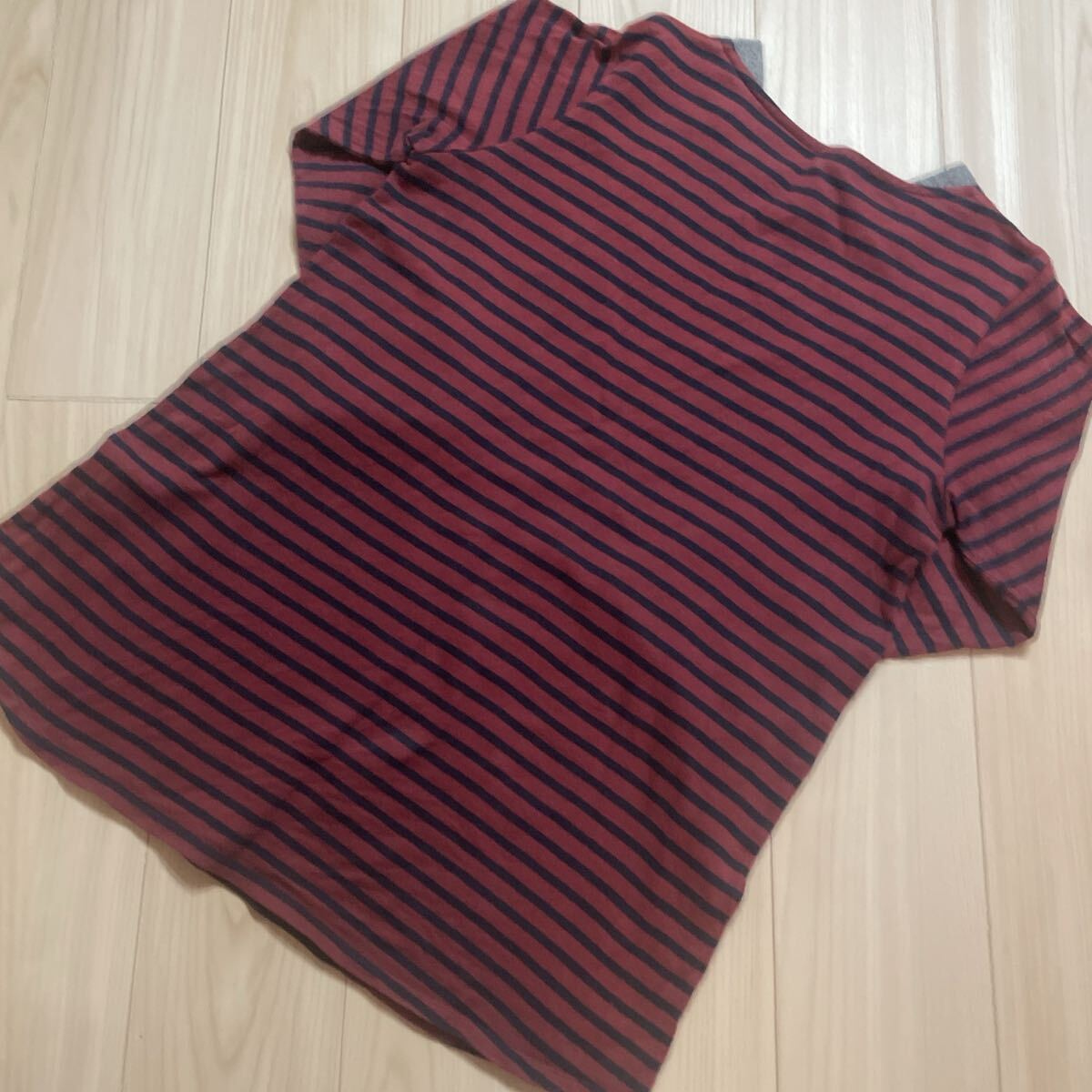 商品:エンジ色にネイビー色のボーダー柄の厚めのTシャツ生地で、Aラインでロング丈の長袖Tシャツです。
