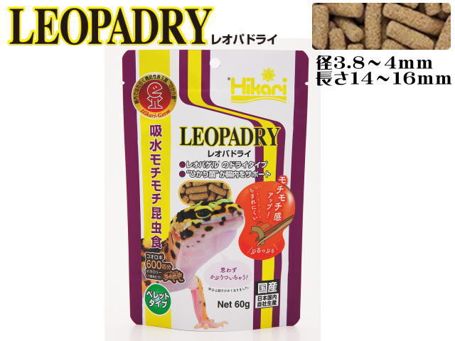 商品名:レオパドライ 60g レオパゲルをベースに昆虫食爬虫類の総合栄養ペレット。 1、ヒョウモントカゲモドキ累代繁殖の実績をもつレオパゲルの配合を ベースとした総合栄養ペレットです。 2、吸水後モチモチとしてピンセットなどで挟んでも崩れない物性です。 3、高い嗜好性で指示されているレオパゲルのドライタイプです。 4、ひかり菌配合で腸内環境を保ち、排出物の臭いも抑えられます。 5、乾燥したペレットのため開封後も長期間保存が可能です。 6、1粒でMサイズコオロギ約2.5匹分のカロリーに相当し、 多頭飼いの方にも経済的にご使用頂けます。 ■与え方 3~5分間を目安に吸水させ、ピンセットなどを使って与えて下さい。 爬虫類が幼体の場合は毎日、成体の場合は2、3日に1回が目安です。 食べない時は、姉妹品のレオパゲルと組み合わせて与えて下さい。 内容量:60g →詳しくはこちら |