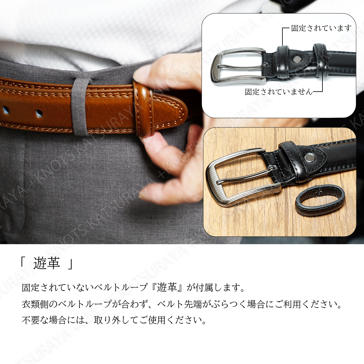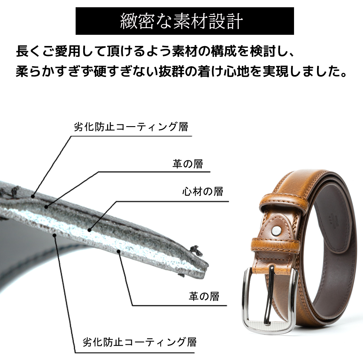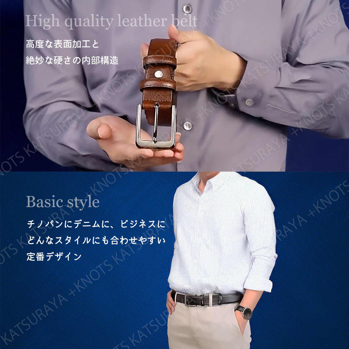 デニムやジーンズ、チノパンなどのカジュアルに相性の良い革製デザインベルトです。シンプルでしっかりとしたバックルが特徴的、ベルト幅は少し太めの37mm、ビジネス用としてもおすすめです。長さの調整は、バックル部のネジを外しハサミで切断後に中央に穴をあけることで行えます。