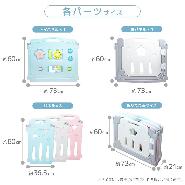 | お子様に安全な軽くて柔らかい素材と丸みを帯びたデザイン! ママにも簡単に組み立てられるベビーサークルです。 赤ちゃんの脳の発達を助けるトイパネルも付いています。 工具不要で組み立て簡単! お好みの形に広げて接続部分のキャップを締めて固定するだけ! 最大スペース約133cm×133cmで広々と遊べます。 外側から扉をロックすることができるので お子様が勝手に外へ出てしまう危険性がありません。 お手入れはサッと拭くだけ! 組み立てたまま拭けるのでお手入れも簡単! いつでも清潔を保てます。 【商品仕様】 内容:パネル ×10 (おもちゃパネル×1、扉パネル×1、パネル×8) サイズ:最大スペース(約)133cm×133cm×高さ60cm 素材ポリエチレン 【カラー】 ・ブルー×ホワイト |