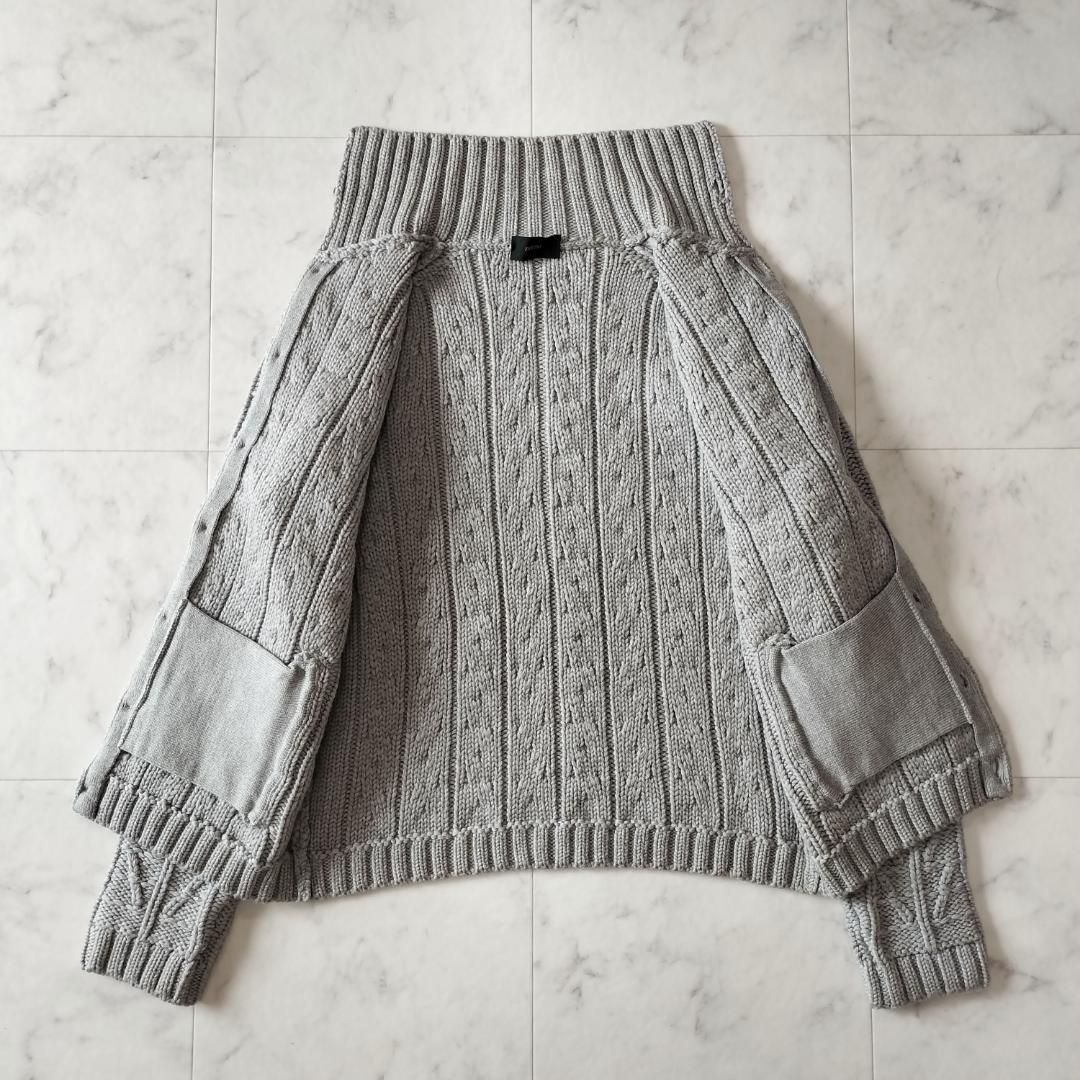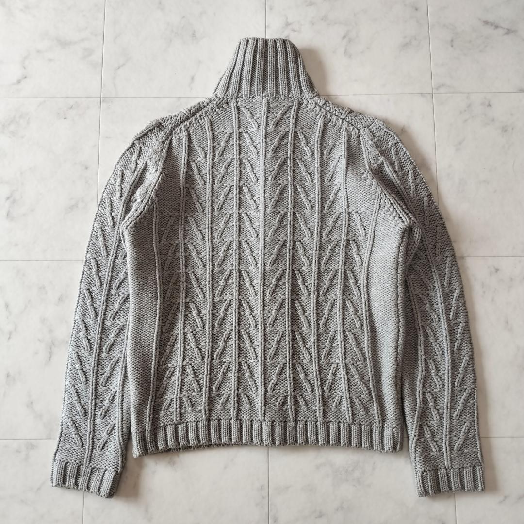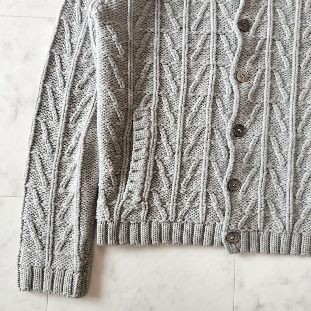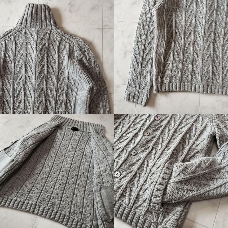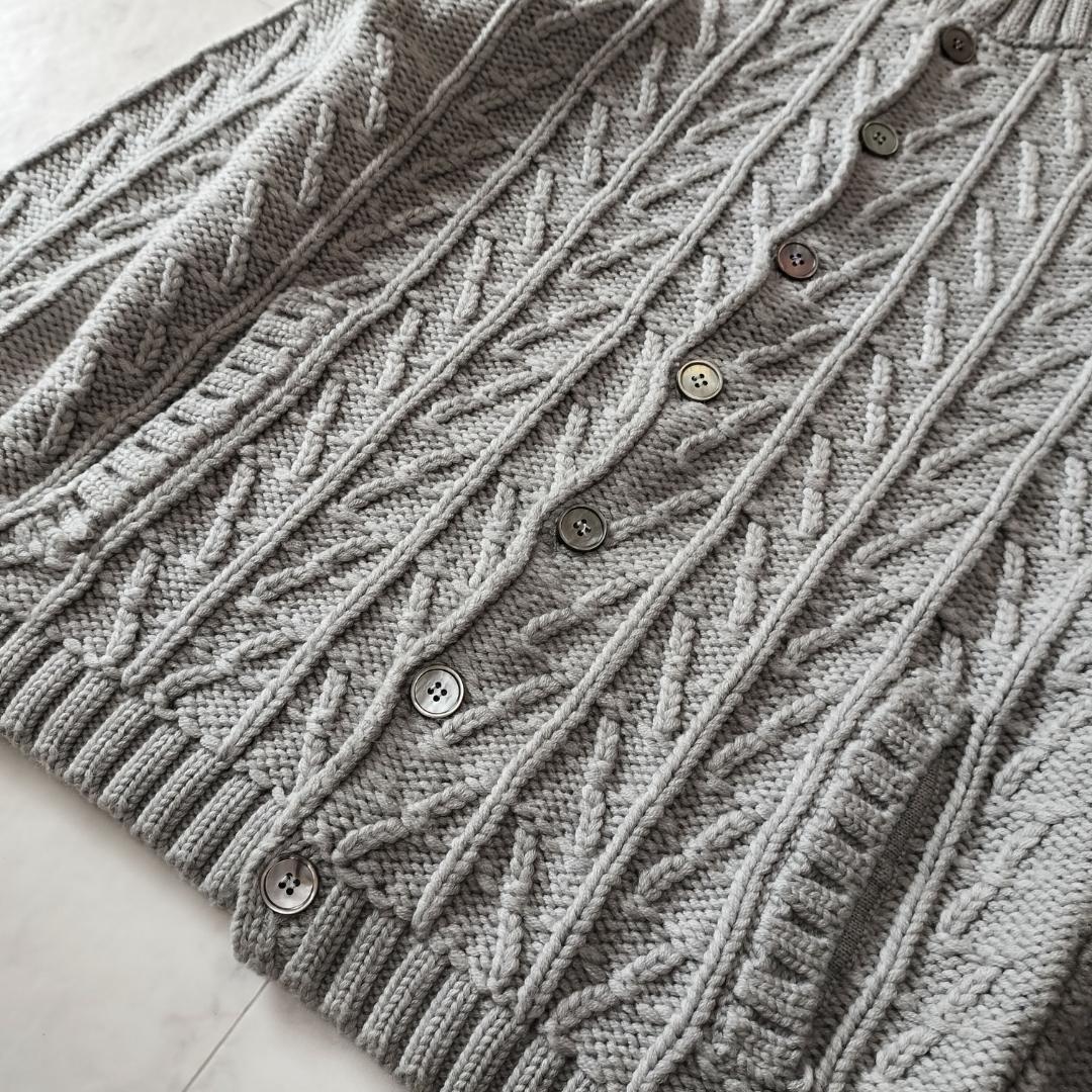全面にケーブル編みを施した立体的なニットが特徴的で、伝統的なフィッシャーマンズセーターを彷彿とさせるデザイン。ライトグレーの落ち着いたカラーが、上品な印象を与えます。