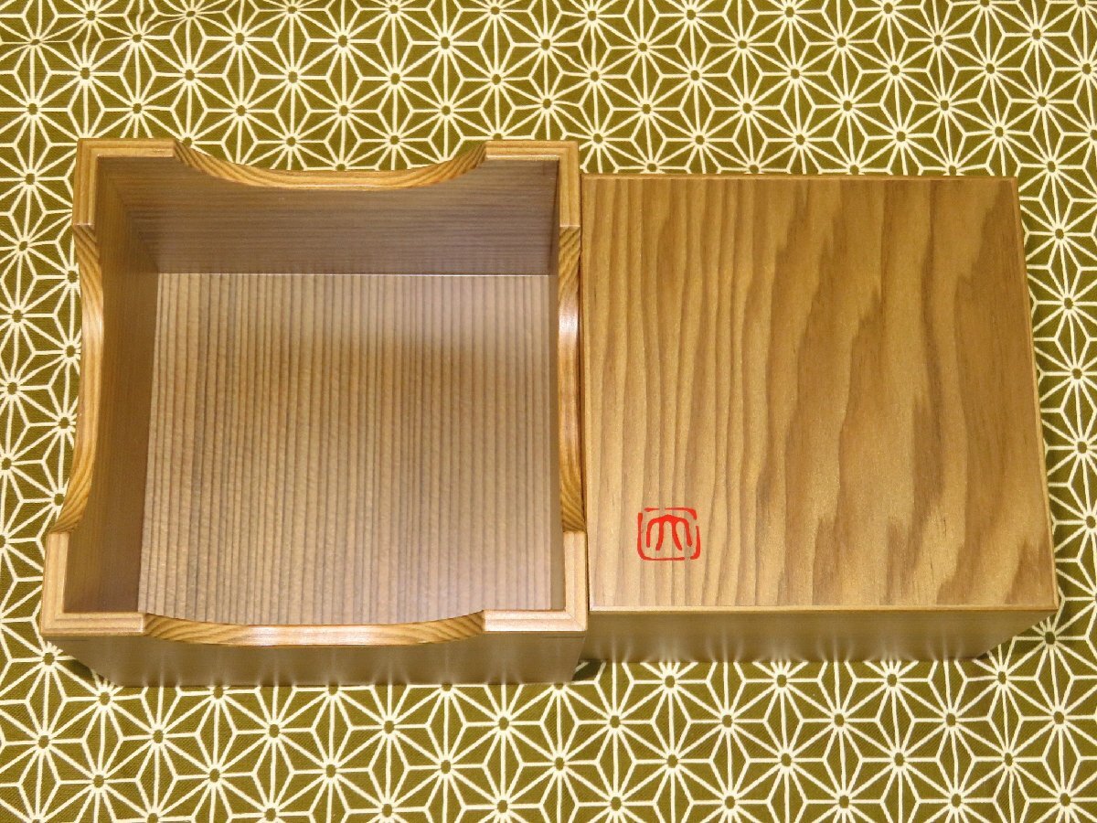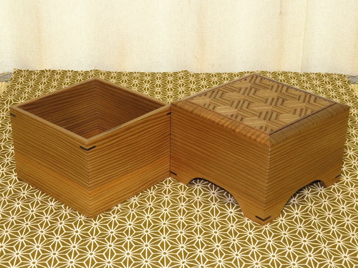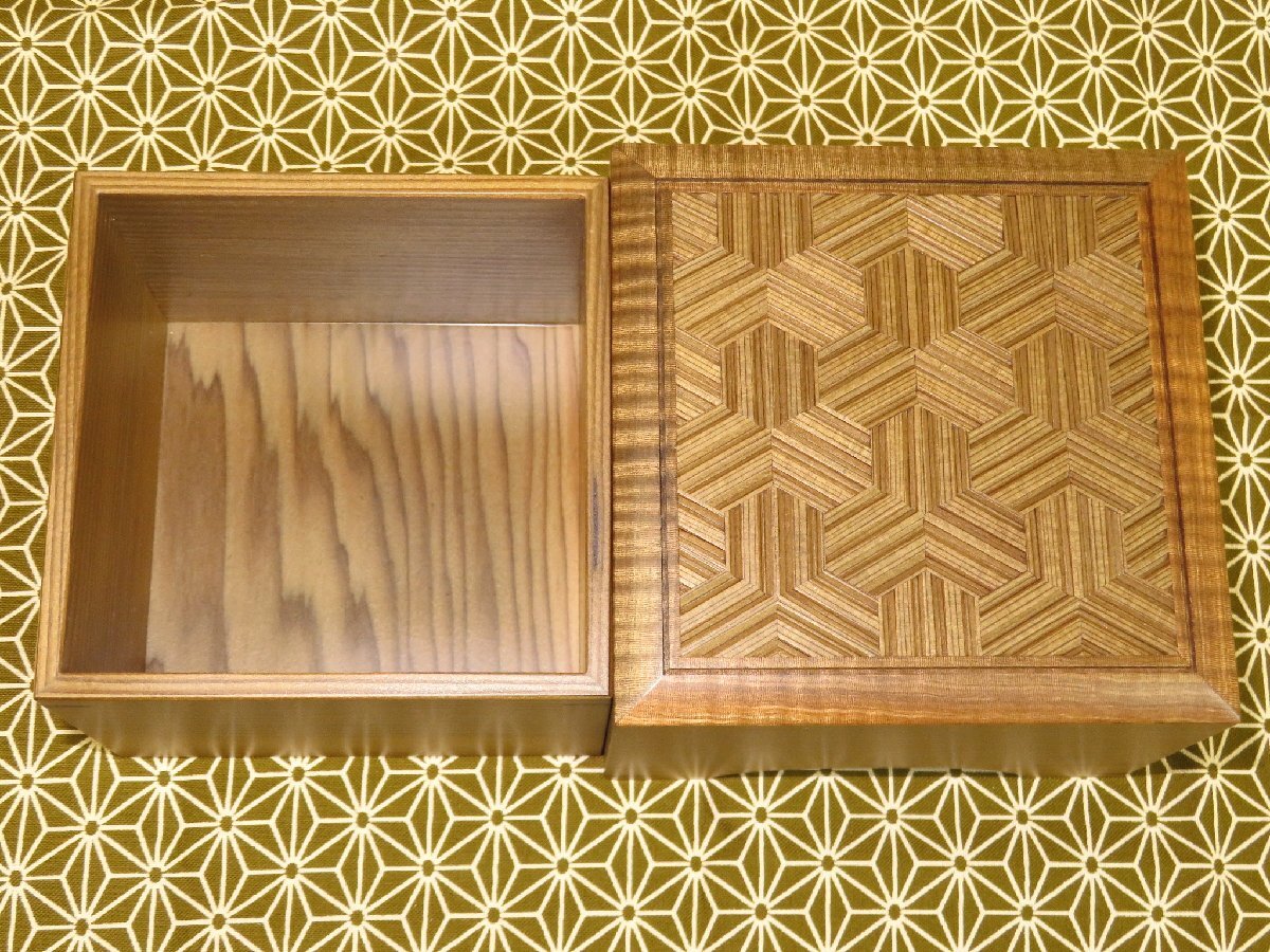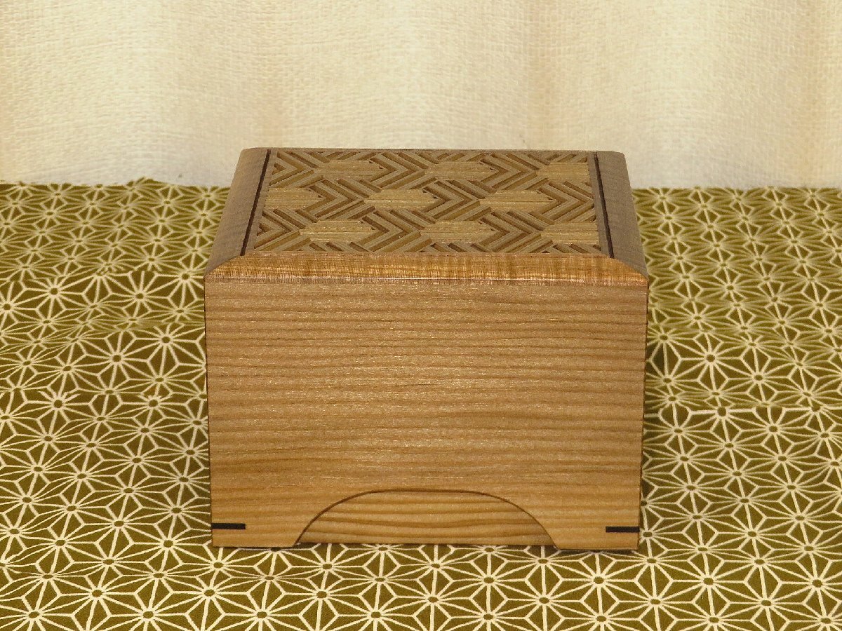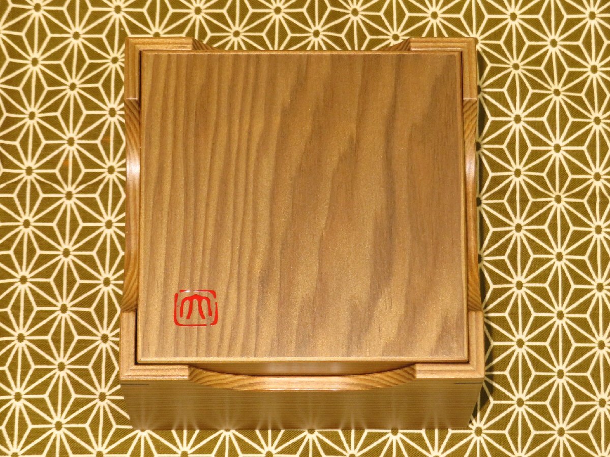 超高級美術組子の第一人者、二代目大橋利一(りいち/1953~)師の作品、銘入神代杉毘沙門(びしゃもん)木画細工駒箱です。新品です。
