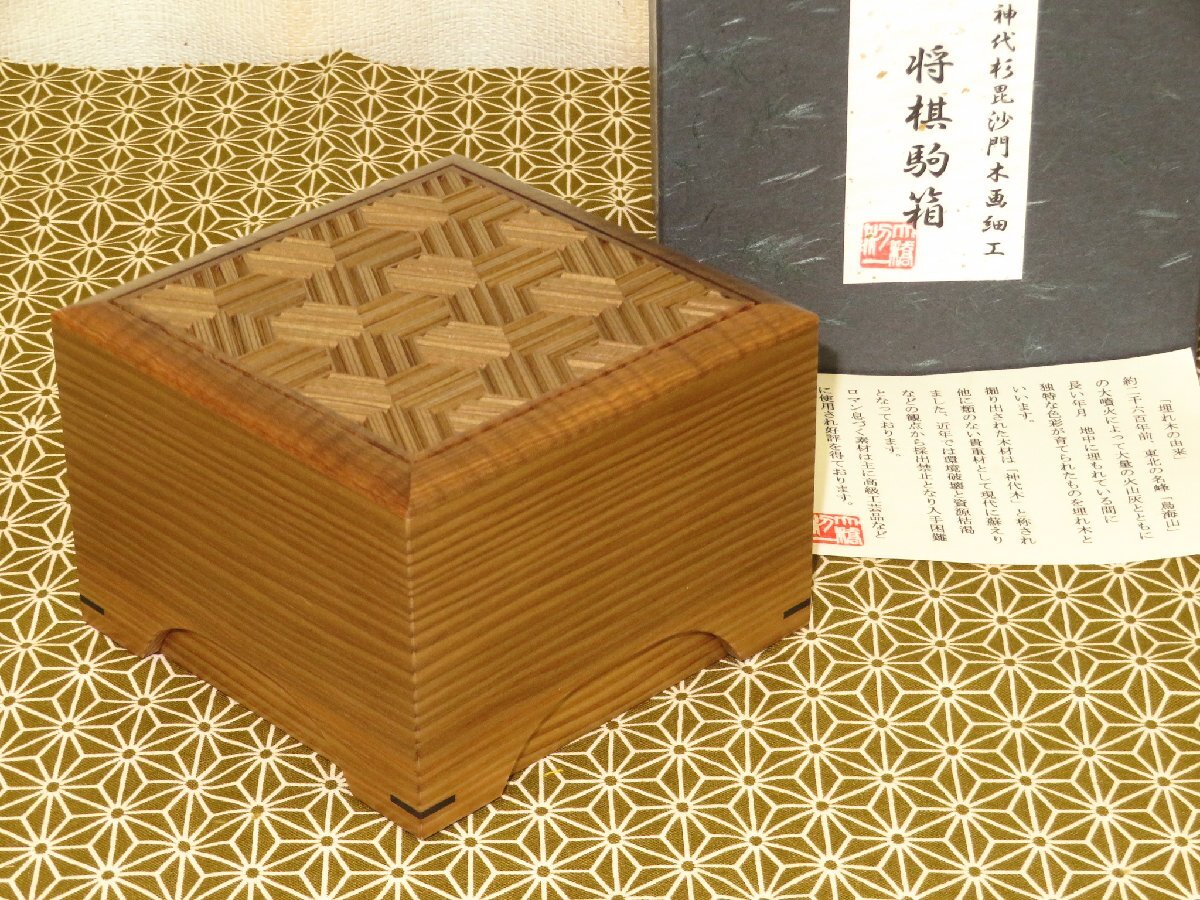 ▲秘伝・大橋利一作銘入神代杉毘沙門木画細工将棋駒箱▲新品紙箱付