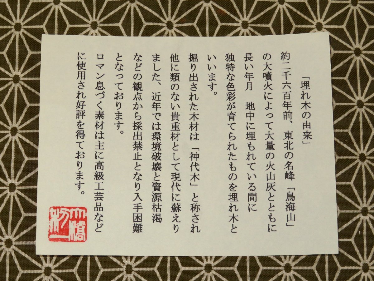 材は神代杉、木画細工による毘沙門柄に回り縁をあしらったさすがにものすごい完成度の高い作品です。高度な技術と時間を惜しみなく投入した美術品とも言える作品です。裏面には師の落款がはいります。