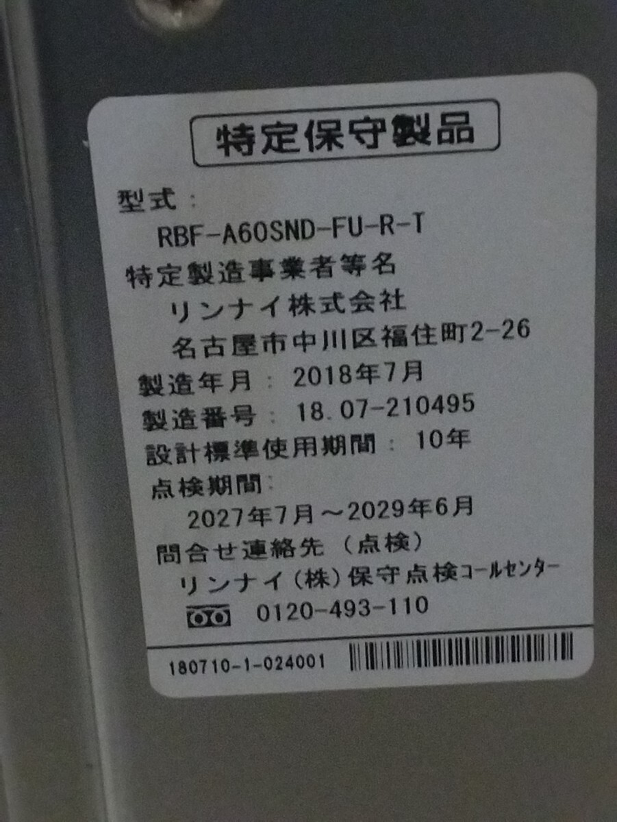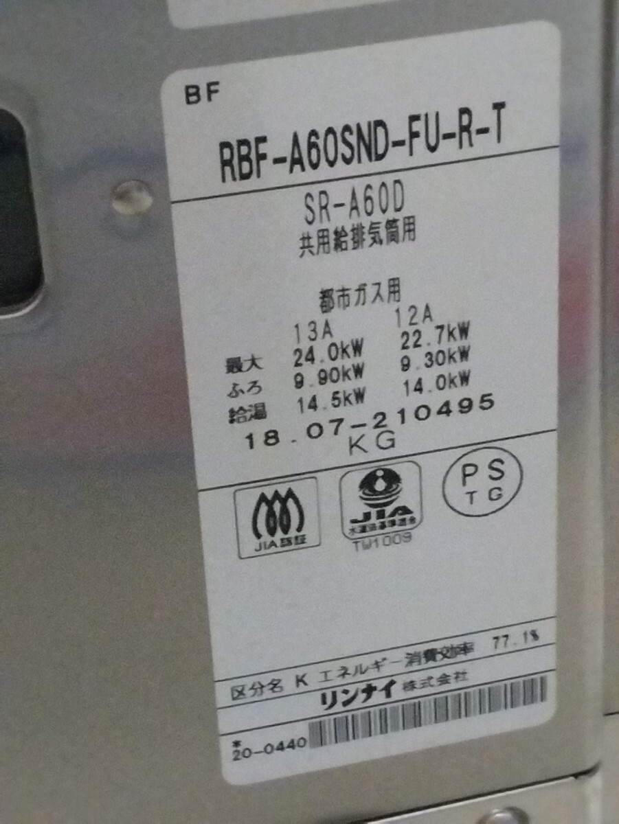 リンナイ ガスふろがま 都市ガス用 RBF-A60SND-FU-R-T 通電確認済