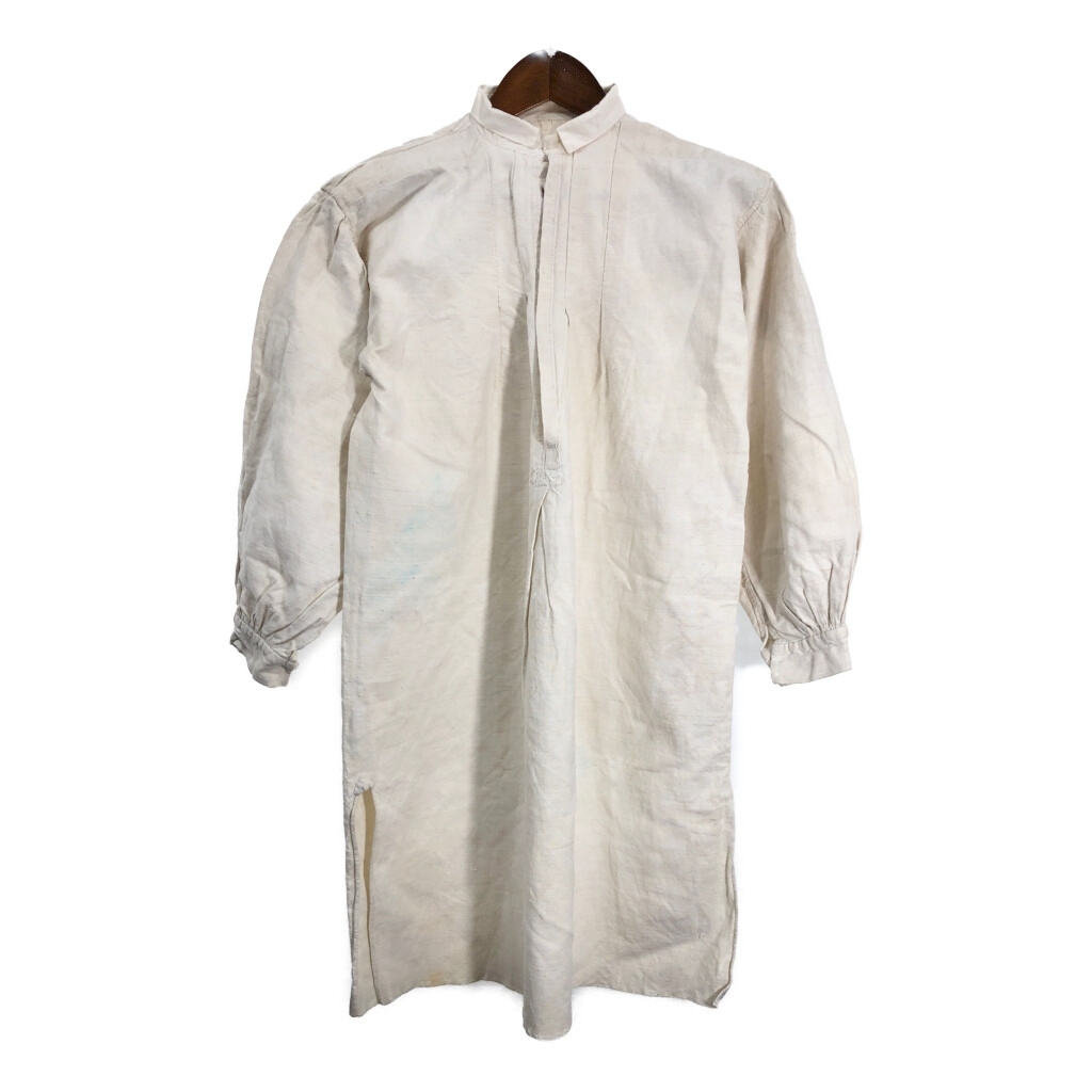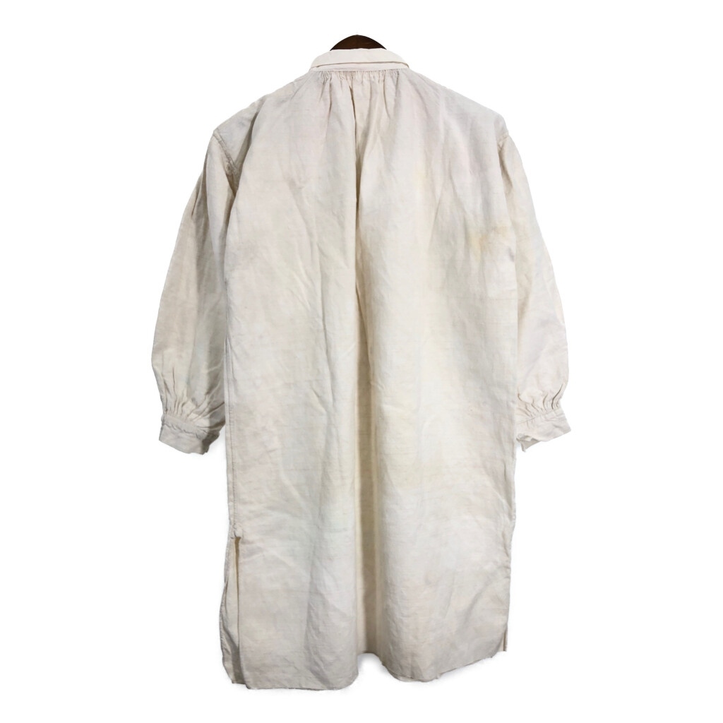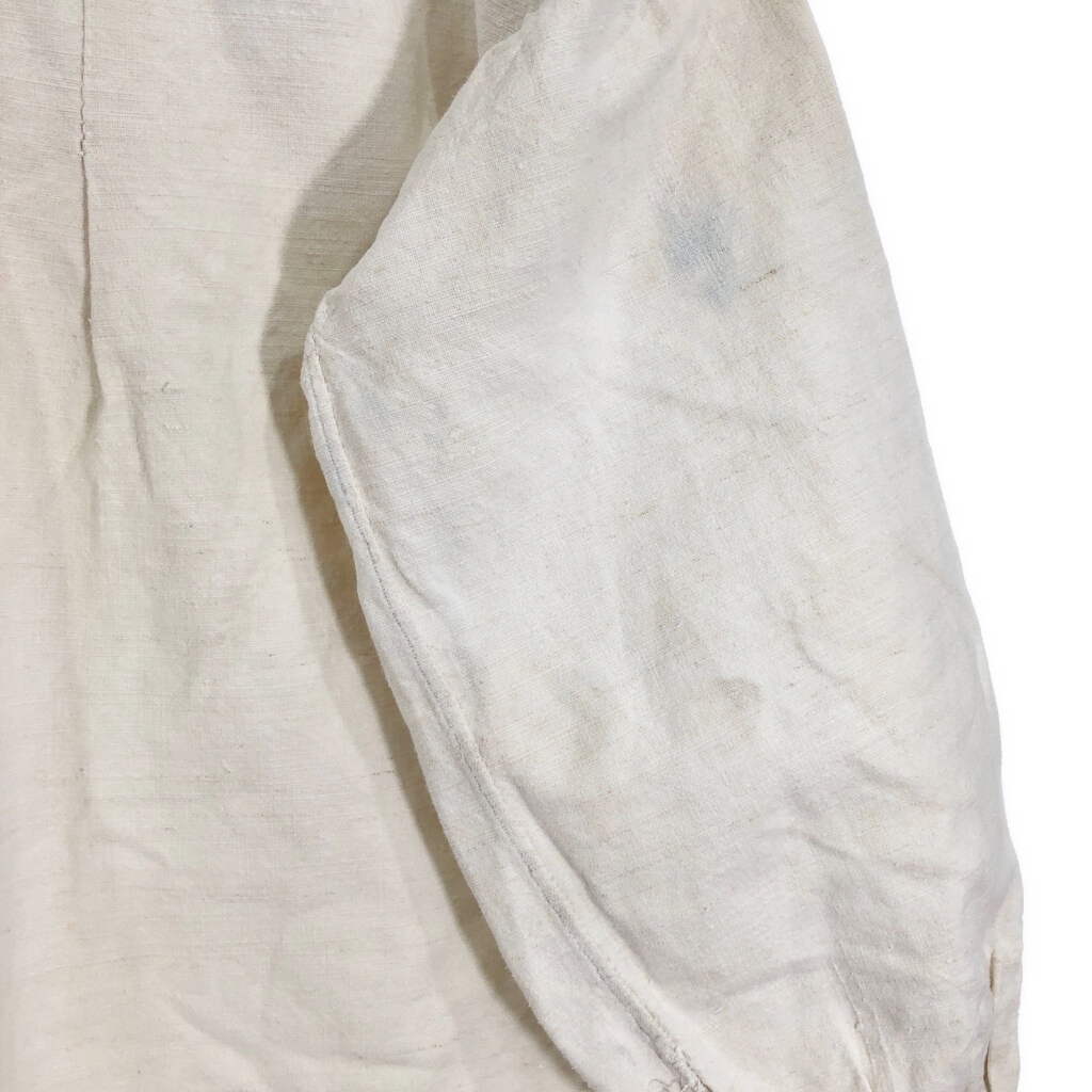 | 【商品管理番号】 R8201 【サイズ】 XL相当 【実寸サイズ】 肩幅:約51cm 着丈:約96cm 身幅:約63cm 袖丈:約49cm 【主な素材】 表地 : 麻・リネン 【色】 アイボリー 【仕様】 30年代 ヴィンテージ、ユーロ フレンチリネン スモック 【状態】 汚れ:全体 特記事項:タグ欠損、色移り | |||