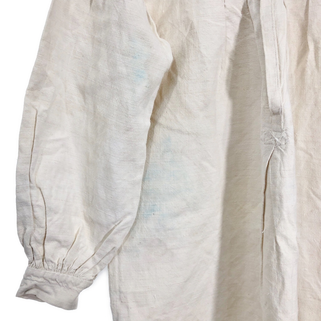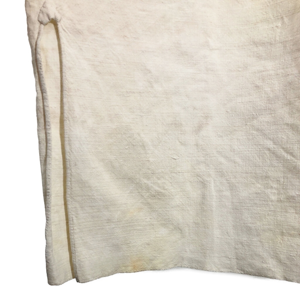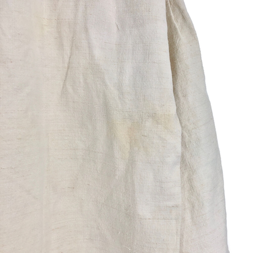 | 【商品管理番号】 R8201 【サイズ】 XL相当 【実寸サイズ】 肩幅:約51cm 着丈:約96cm 身幅:約63cm 袖丈:約49cm 【主な素材】 表地 : 麻・リネン 【色】 アイボリー 【仕様】 30年代 ヴィンテージ、ユーロ フレンチリネン スモック 【状態】 汚れ:全体 特記事項:タグ欠損、色移り | |||