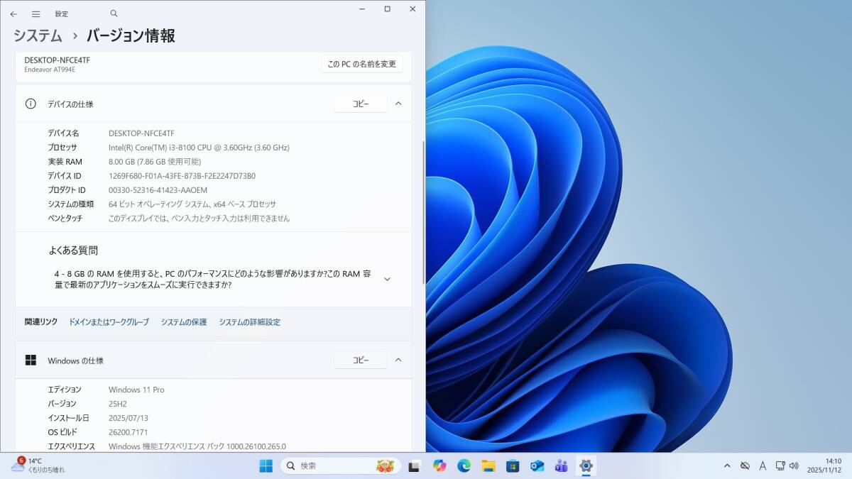 Core i3-8100@3.6GHz/RAM8g/SSD240g+HDD500g/DVD RWドライブ /Win11Pro(最新版25H2)/MS office2021/中古動作品