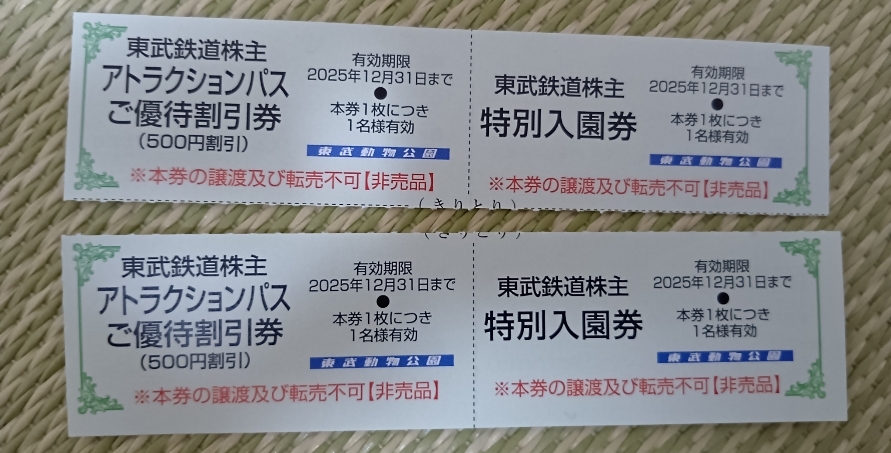 ⑥2枚 東武鉄道 株主ご優待券 東武動物公園 12/31 TOBU 無料入園券 観光 宿泊 旅行 チケット アトラクションパス割引券 クーポン券 埼玉