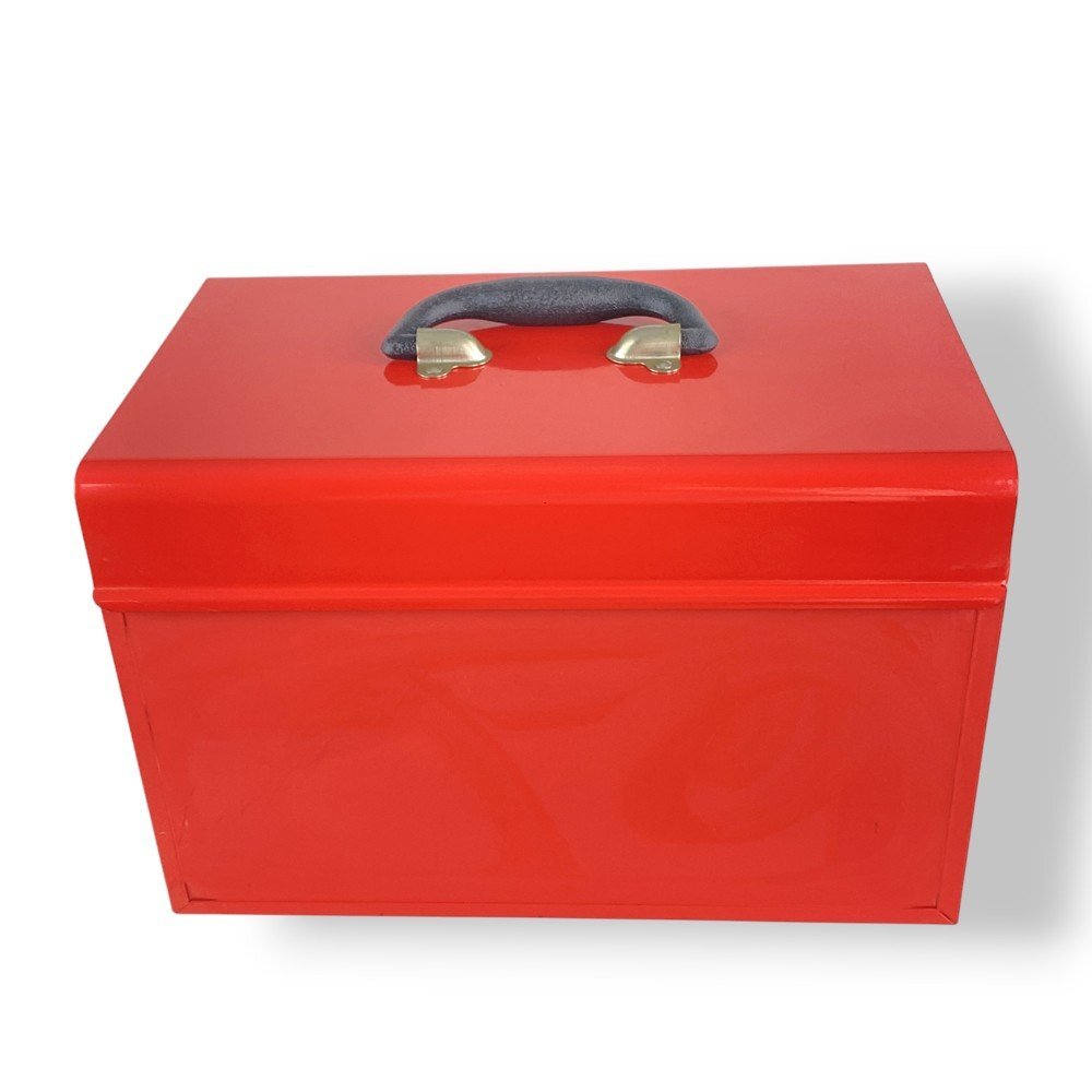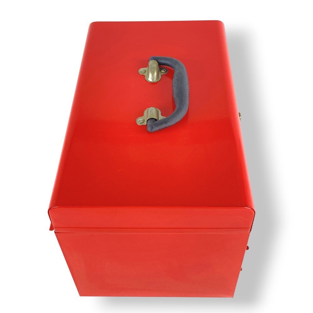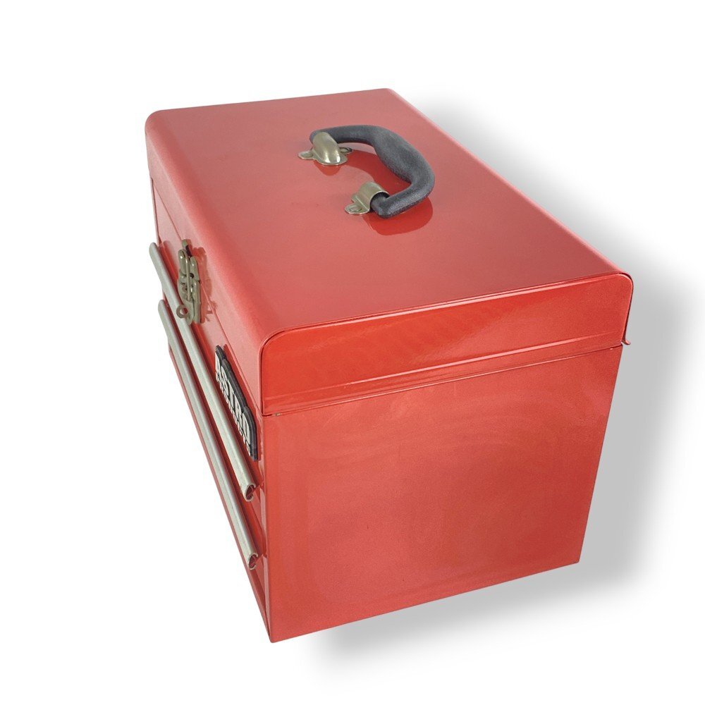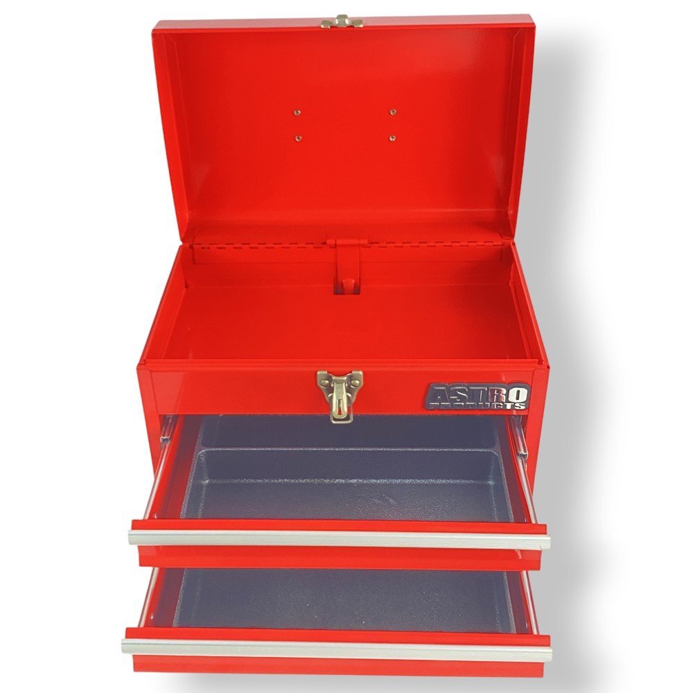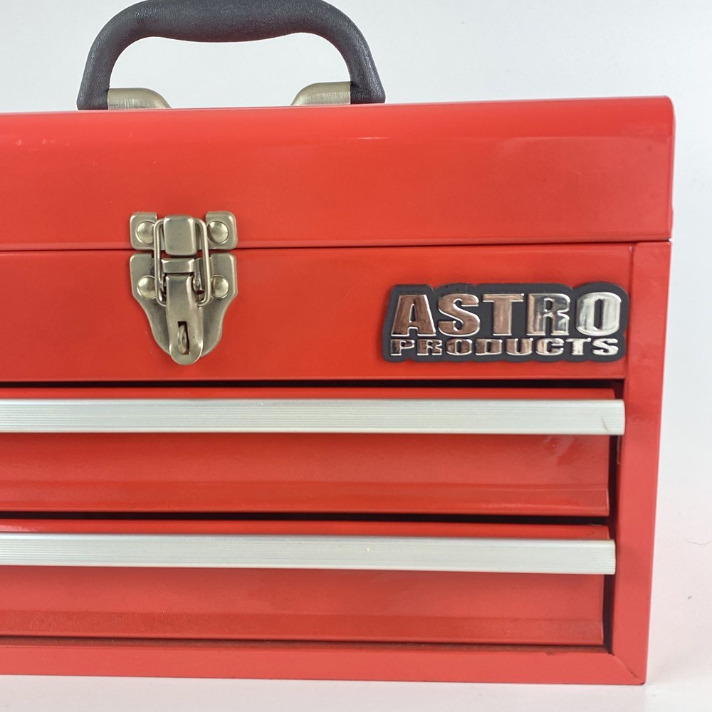 商品説明 | アストロプロダクツ製の堅牢なスチールツールボックス。上段の開閉スペースに加え、下部には2段の引き出し式収納を備えた実用性の高い構造 メタリックレッドの塗装仕上げが美しく、作業場やガレージに映えるデザイン。ハンドル付きで持ち運びにも便利。上部は開閉式のフタにラッチ付きロックを採用し、安全性と使いやすさを両立 内側は広めの収納スペースを確保しており、ラチェットレンチやドライバー類などのハンドツールを整理整頓可能。軽量ながら頑丈な構造で、日常の整備作業やDIYツール収納にも最適 実用性とデザイン性を兼ね備えたプロ仕様のツールボックスです |