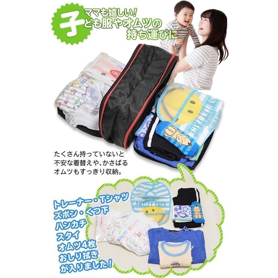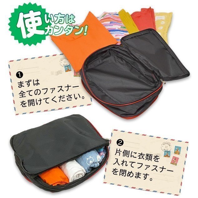 | 衣類を入れてファスナーを閉めるだけ。 かさばる衣類が圧縮される!スーツケースの中もスッキリするポーチ! 圧縮袋のように巻いたり、空気を押し出したりする手間なし! 衣類を入れたあと、周囲のジッパーを閉めることでその容量を圧縮。 収納する量にもよりますが、およそ40~60%ほどのスペース削減が期待できます。 収納スペースは2室で、どちらにも衣類を入れて最後に真ん中についている ファスナーを閉めたら圧縮完了。巻いて空気を抜く手間も無く、掃除機などでの 吸引も不要!出発前ギリギリ!そんなときでもパパっと荷造り♪ 片側には「使用前の衣類」、もう片方には「使用後の衣類」というように 分けて収納するのも◎ インナーや靴下などの小物でもまとめてスッキリ☆ 中身が見えないので下着やサニタリーグッズも安心して入れられます。 非常時のために、衣類を入れて防災袋に常備するのもGOOD◎ 外側は撥水加工がされており、水しぶきや水滴に対応。 タオルなどを入れて、ビーチやプールサイドに持って出ることもできます。 洗面所やシャワー室にも安心して持って行けますね♪ 小さなお子様の着替えやおむつを入れる、おむつポーチにもおススメ! 紙パンツのBigサイズでも5枚+おしりふき+着替え+お食事スタイ+タオル などのおでかけ用品・保育園一日分がかさばらず入ります♪ ママも育メンパパも荷物がスッキリしますよ! 旅行や出張のとき、どうしても荷物が多くなってしまう・・・ 服を畳むのが面倒で荷造りが苦手・・・ 帰りにお土産を入れるスペースが無い・・・(T_T)!そんな方ももう安心! この圧縮ポーチさえあれば荷物が少なくなり、スペースを確保できます! あら、ちょっと服を入れすぎたな・・・ そんなときには最後の中央のファスナーを閉めないで使ってもOKです◎ |