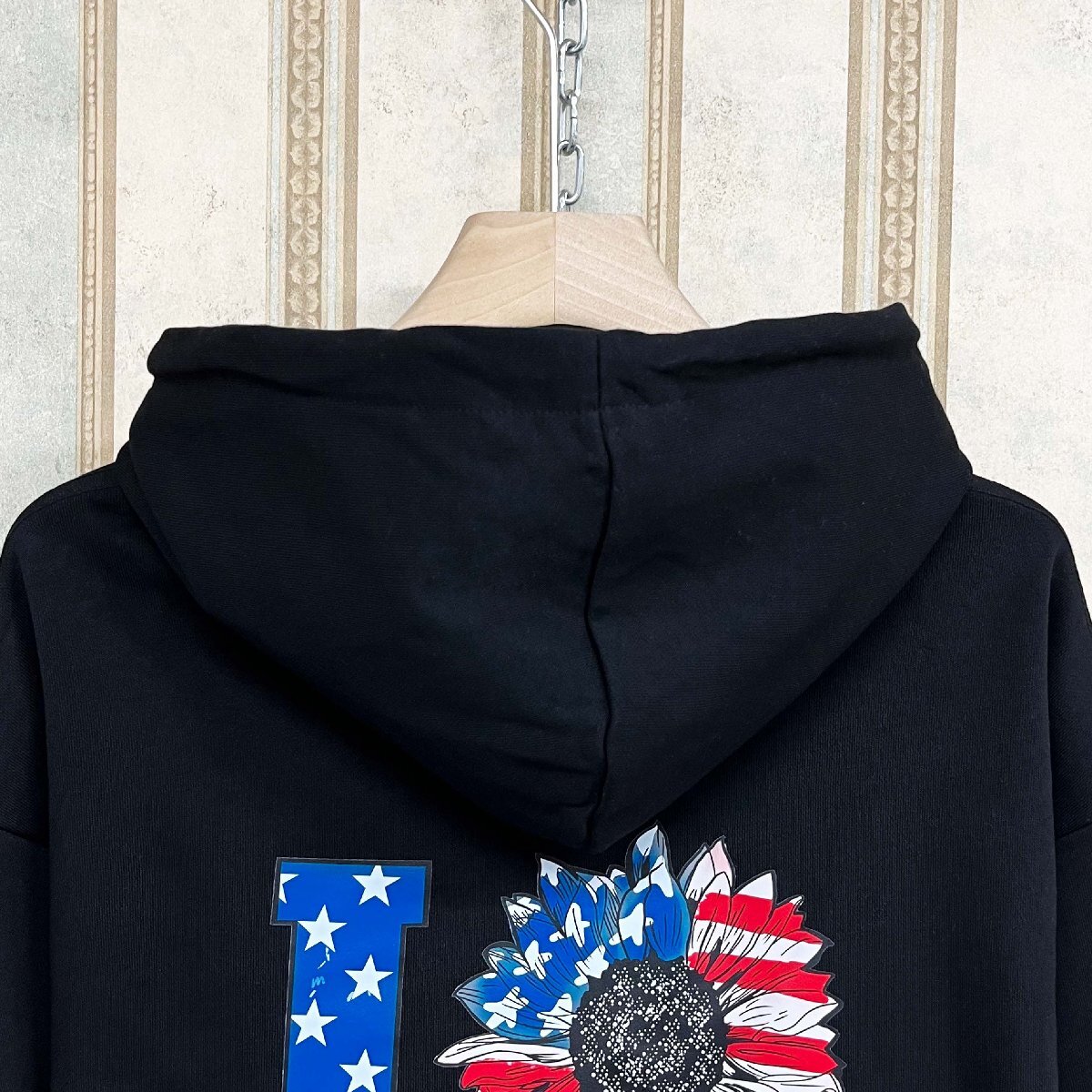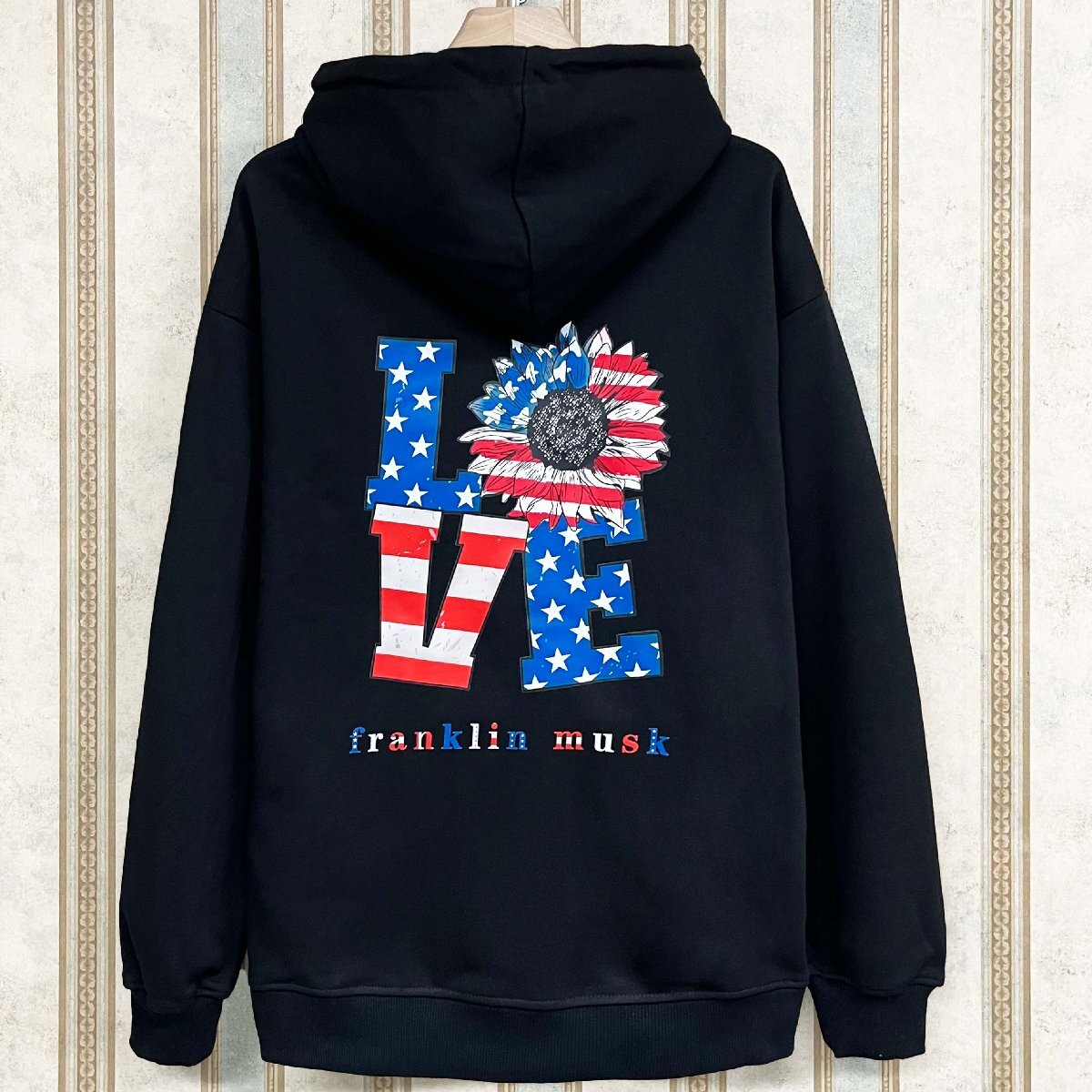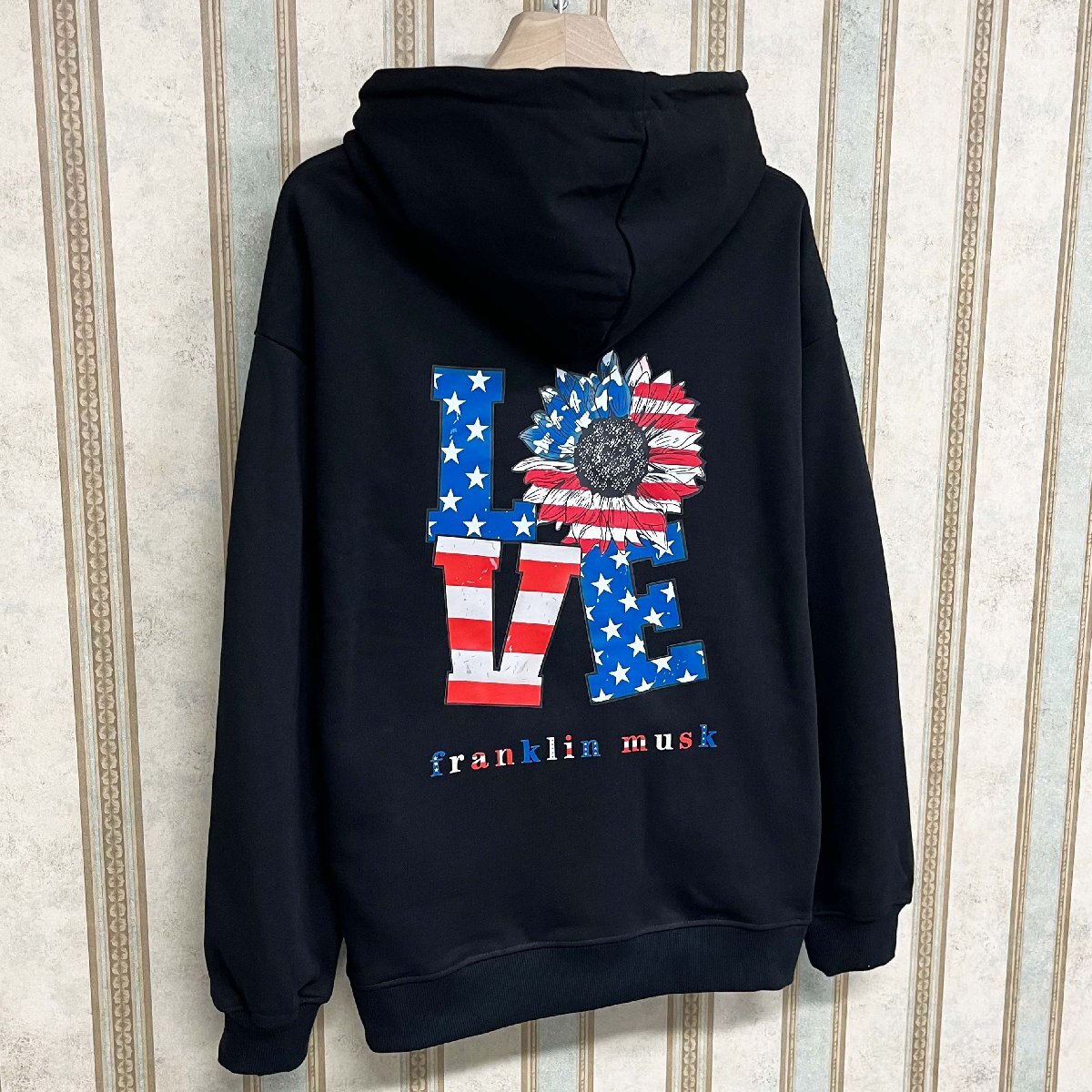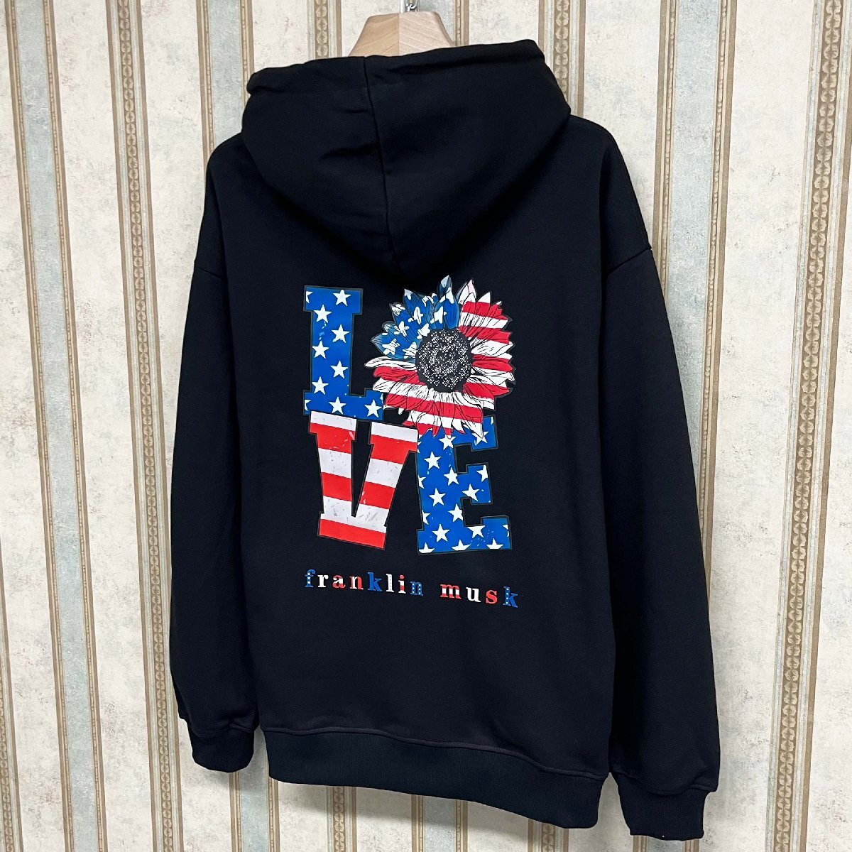 ゆったりとしたクラシックシルエットで体型を選ばず、胸元にさりげなく配置された英文がアクセントに。背面には“LOVE”の文字と、アメリカ国旗、ひまわりのモチーフを組み合わせたデザインが描かれています。自由と希望を象徴する一着です。一枚で二つの表情を楽しめる逸品です。