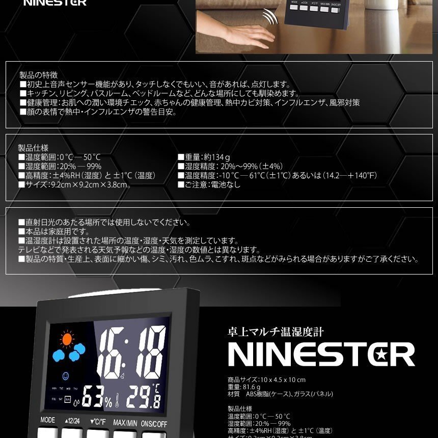 | 送料無料!!! 送料及び下記のご案内をご確認の上、ご入札お願い致します。 離島地域を除く九州、四国、本州まで送料無料。 ※北海道は+1000円、離島地域及び沖縄県は+3000円にて承ります。(発送前に加算) ※画像内にカラー及びサイズ等の選択が可能と記載がある場合がございますが、 お届けする物はタイトルまたは商品説明文に記載の物です。 ★※注文後のカラー変更や異なるカラー・サイズ指定等は一切承っておりません。 ※★※仕様(ロゴデザイン/ロゴ有無等も含む)は予告なく変更する場合があります。 ※多少の汚れや小傷がある場合がございますがご了承ください。 梱包は簡易包装ですので、箱の角落ち等はご了承願います。 =============== 【シンプルなデジタル置時計】 部屋の温度管理、湿度管理に見やすさ抜群です。 温度、湿度、目覚まし時計、日付、時間、そしてなんと天気予報の機能もついた優れモノ。 黒のフレームとカラー液晶の相性が抜群で見やすい、しかもカッコイイです。 独自の音声センサー反応式 コンパクトで文字も大きく、音声センサー機能付きで遠くからでも確認できます 「インフルエンザや風邪を予防したい」「お肌の乾燥が気になる」 「暑い時期に熱中症のを防ぎたい」 様々な声にお応えしる便利なデジタル時計です。 =============== 【製品の特徴】 独自の音声センサー反応機能があり、タッチしなくてもあなたの声で点灯します。 キッチン、リビング、バスルーム、寝室など、どんな場所にしても馴染めます。 製品仕様 温度範囲:0 °C 50 °C 湿度範囲:20:% 99% 高精度:±4%RH(湿度) と ±1°C (温度) サイズ(約):9.2cm×9.2cm×3.8cm。 重量:約134g 湿度精度: 20%~99%(±4%) 温度精度:-10 °C 61°C(±1℃)あるいは(14.2―+140?) =============== ![]() ![]() ![]() ![]() ![]() ![]() |