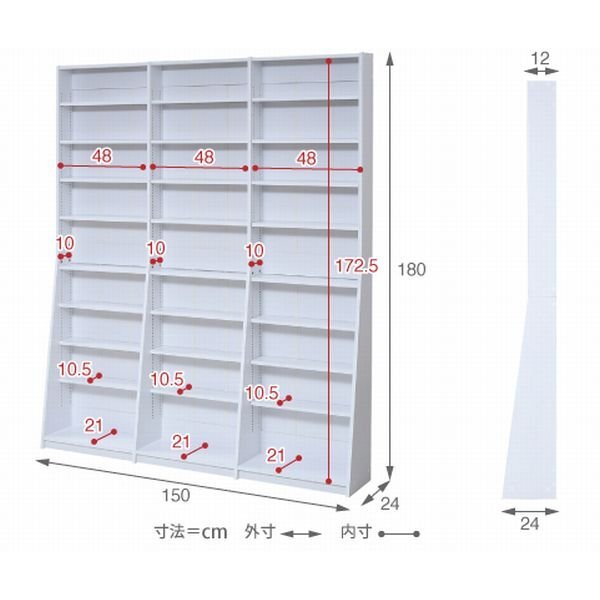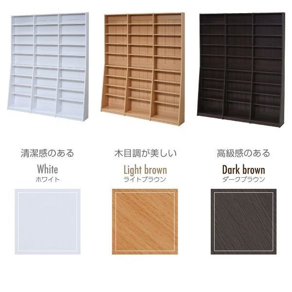 【カラー】 ダークブラウン、ライトブラウン、ホワイト 【サイズ】 <外寸> 幅150×奥行24×高さ180cm <内寸> オープン部:幅48×奥行10~21×高さ172.5cm 可動棚:幅47.5×奥行10.5×厚み1.5cm(1cmピッチ138穴) 【材質】 本体:プリント紙化粧合板 【耐荷重】 可動棚:各(約)5kg以下 収納量:文庫本(約)837冊、コミック(約)837冊 【生産国】 ベトナム 【梱包】2梱包でお届けします。 2-1 サイズ:93×53×11cm、重量:24.5kg 2-2 サイズ:98×41.5×10cm、重量:18.5kg 【その他】 ・可動棚:24枚 【組み立て品】 お客様による組み立てが必要です。 【ご注意】 ・サイズ、重量は概算です。 ・商品カラーはご使用のモニターによって実際の明るさや色と異なって見える場合がございます。 |