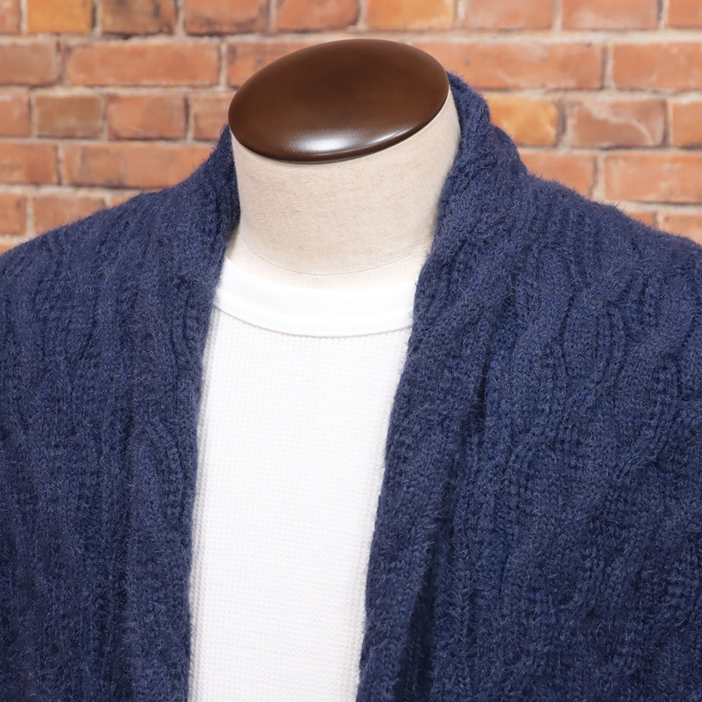 アクリル、ナイロン、ウールをブレンドしたケーブル編みニットで仕立てたカーディガン。ショールカラーとボタンレスデザインが特徴で、ラフでありながら上品な大人の雰囲気を演出します。
