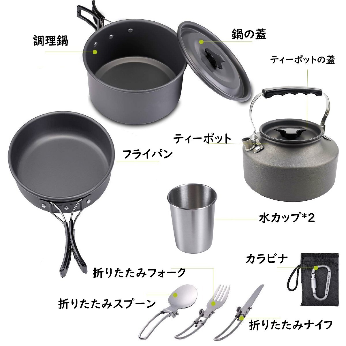【セット内容】:クッキングポット*1+フライパン*1+ティーポット*1+スプーン*+ナイフ*1+フォーク*1+304ステンレス製ウォーターカップ*2+カラビナ*1+収納袋