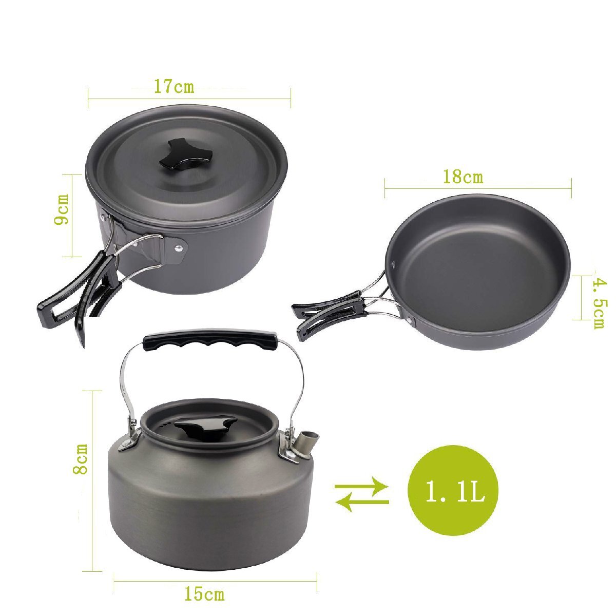 ■ 大きな鍋、フライパン、ティーポット、304ステンレススチールカップ2個、フォーク、スプーン、ナイフ、カラビナを含む2~3人に適しています。