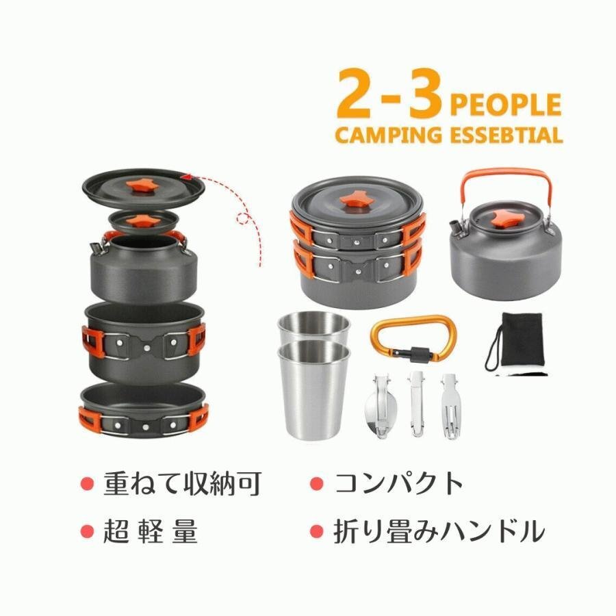 アウトドア 鍋 クッカーセット 調理器具 アルミニウム 軽量 鍋 ケトル キャンピング 10点セット 2~3人用 収納袋付き