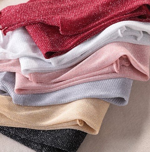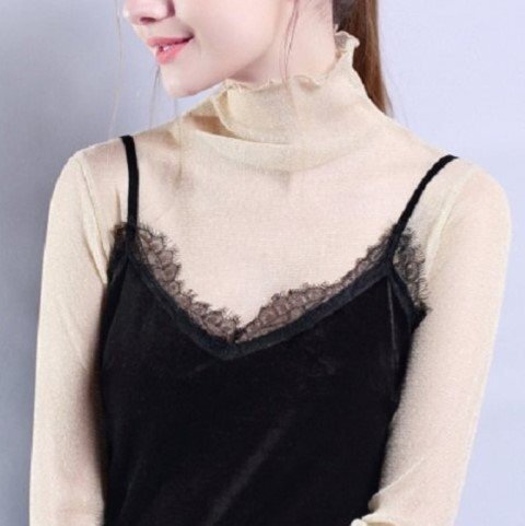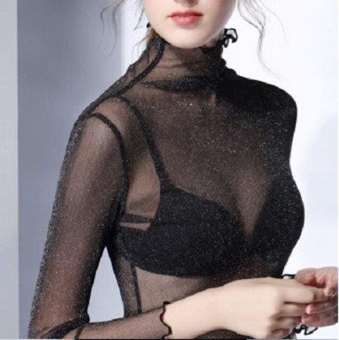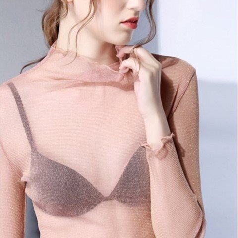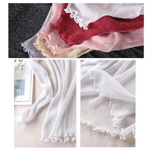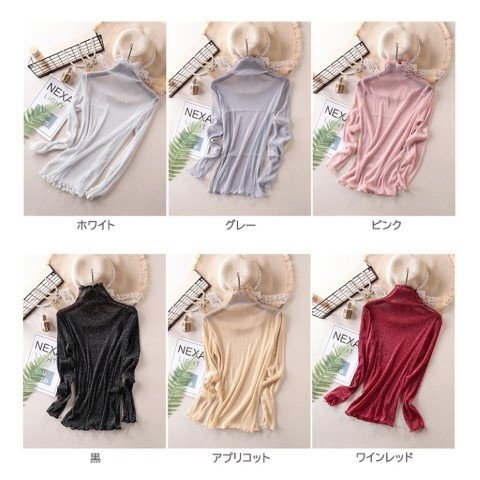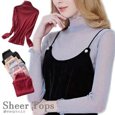・ボディラインをきれいに魅せてくれるラメ入りシアートップス。袖や首回りがフリルデザインでフェミニンさをプラスしてくれます。