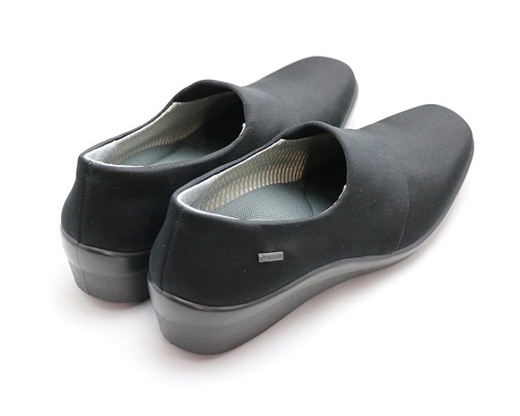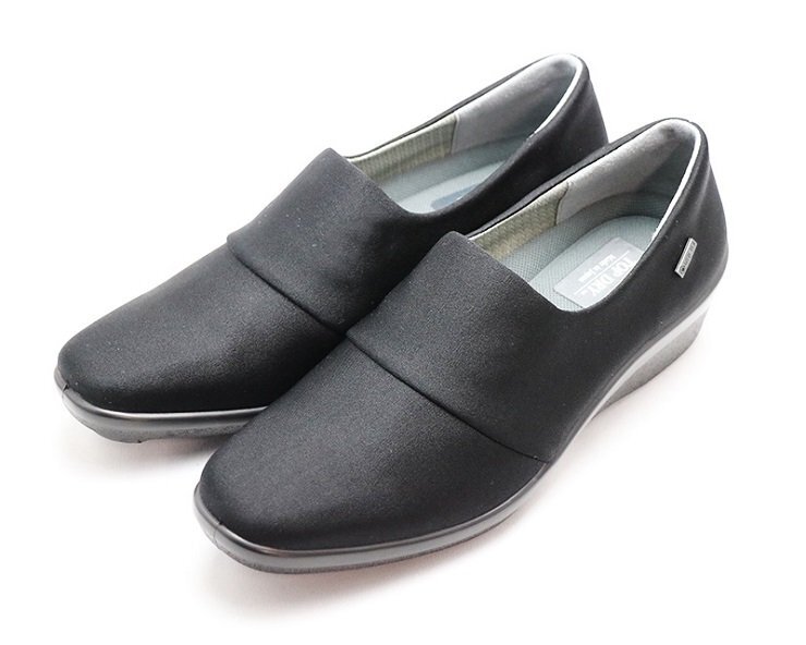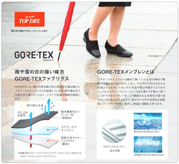 | 「スマートで楽、シンプルでどんな服装にも合わせやすい」をコンセプトに 開発されたパンプスです。 甲部には伸縮性のある素材を使用。足を優しく包みます。 ■防水・透湿性の高い機能素材「ゴアテックスファブリクス」を採用 悪天候でも快適な歩行を実現します。 ゴアテックスフットウエアの機能性は、優れた防水性と透湿性を兼ね備えた ゴアテックスファブリクス(ゴアテックスメンブレンに高機能の生地をラミネートしたもの) により、足をドライな状態に保ちます。 ゴアテックスメンブレンは極めて薄いフィルム状素材で無数の孔があり、 それぞれの孔の大きさは、水滴よりも小さく水蒸気より大きいので、 水は侵入させずに汗の水蒸気は発散させます。 雨の中でも靴の中を濡らすことなく快適性を実現します。 ■ふんわりカップインソールを採用 厚みのあるふわっとしたインソール。 踏付部と踵部の最大圧は9mmもあり、履いた瞬間に柔らかさを体感できます。 表面には抗菌・速乾素材を使用。 インソールを取り外して洗えるので、靴の中を清潔に保てます。 また、通気性がありムレにくく快適です。 ■セラミックソール グリップ性に優れた特殊ラバーに繊維状のセラミック粒子を配合しました。 磨き込まれた床や凍結した路面でその効果を発揮、滑りにくく快適な歩行の為のソールです。 ■撥水加工つき。さらに市販の防水スプレーをご使用いただくと撥水性が アップします。 ■PUインジェクション製法 上部と靴底を一体成型することで接着が強く、底が剥がれにくい製法です。 ■日本製 | |