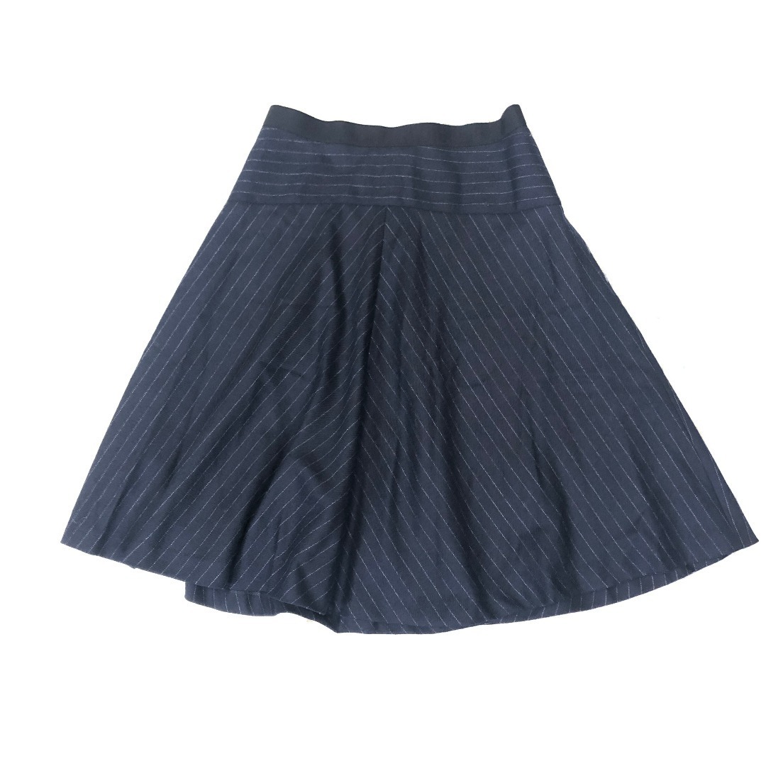 ネイビー地に細かなピンストライプが施された、上品なAラインのフレアスカートです。ウエストから裾に向かってきれいに広がるシルエットで、スタイルアップ効果が期待できます。