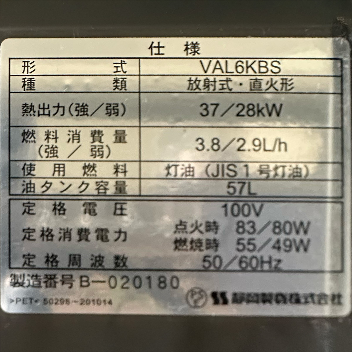 | 【仕様】 型式:VAL6KBS 熱出力(kW):37(強)28(弱) 熱出力(kcal/h):31,800(強)24,200(弱) 燃料消費量(L/h):3.8(強)2.9(弱) 油タンク容量(L):57 燃焼持続時間(h):15(強)19(弱) 定格電圧及び消費電力(50/60Hz):AC100V 点火時83/80W 燃焼時55/49W 温風吐出量(m3/min):ー 運転音(dB(A)):66(強)63(弱) 首振り角度又は温風吐出角度(度):上方20 外形寸法(高×幅×奥行mm):884×675×703 放熱ディスクφ562 質量(タンク空時)(kg):40 暖房適応面積(m2):木造127~152 コンクリート176~211 ※上記情報は中古品の為、参考値となります。 |