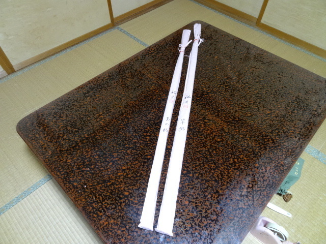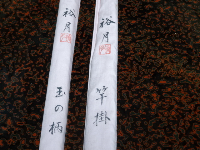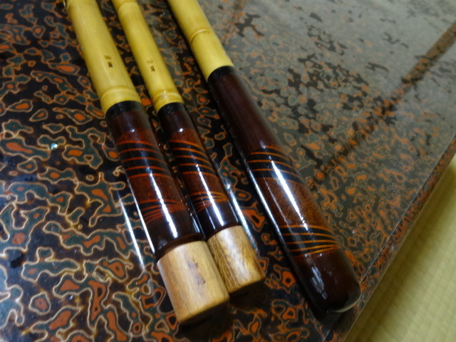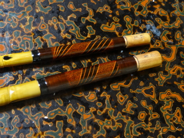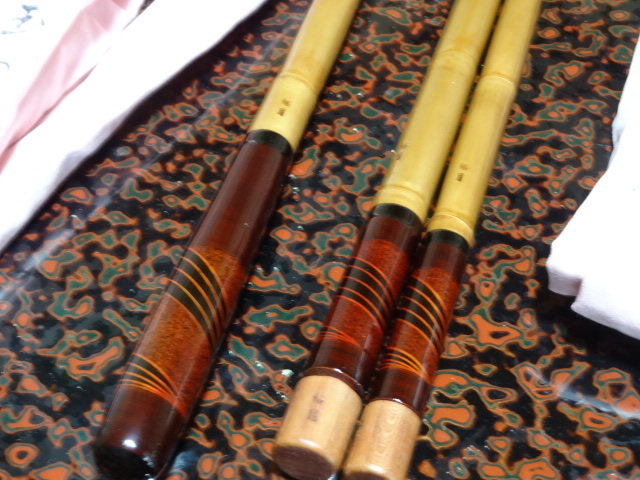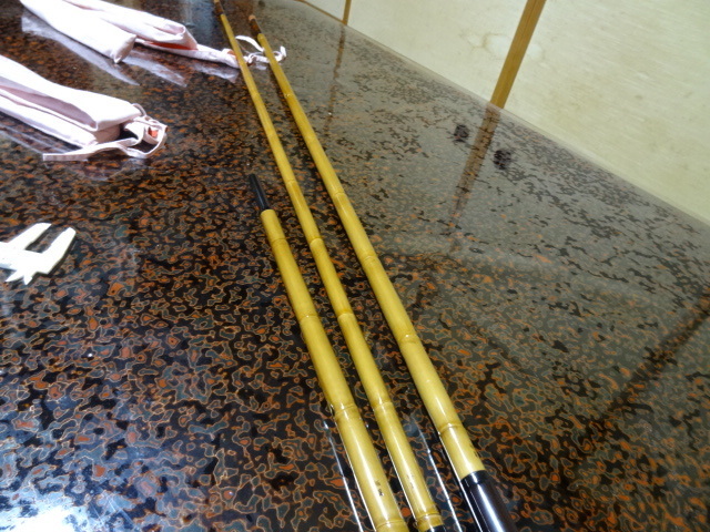 壮志親方愛弟子裕月作竿掛け一本半、玉の柄一本になります、メンテの少ないウレタン仕上げ、口割れトラブル等少ないオーソドックス籐乾漆飾り細工、籐巻きサンド仕様、竿掛け一本10節全長約114センチ、追い継ぎ4節約39センチ、玉ノ柄8節全長約109センチでどちらかと言えばこれからのシーズン18尺位までの中竿向きに思います、使用に伴うスレ、小傷、袋汚れ等あると思いますが気になる大きなダメージ等はないと思います、トラブル避ける為、画像参考の上御検討下さい。