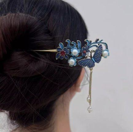 淡水真珠の髪飾り青かんざしのフリンジを模してかんざしを揺らす