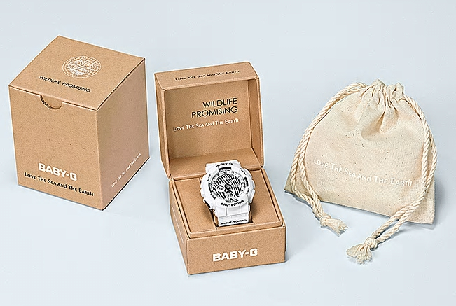 今回のモデルは、絶滅の恐れがある野生動物としてワシントン条約に登録されている「グレビーシマウマ」がテーマのペアウオッチ。グレビーシマウマの縞模様を時計にデザインしました。遊環とバンドにWILDLIFE PROMISINGのロゴを施し、裏蓋には「Love The Sea And The Earth」のシンボルマークを刻印。また、スペシャルパッケージにはプラスチック素材を廃止し、紙箱には再生紙を使用。時計の製品袋には、ポーチとしても利用可能な綿100%の巾着袋を取り入れました。