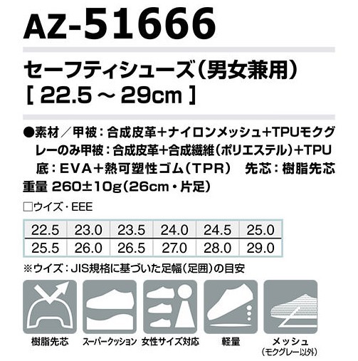 • 素材:《甲被》合成皮革+ナイロンメッシュ+TPU(モクグレーのみ:合成皮革+合成繊維 ポリエステル+TPU)、《底》:EVA+熱可塑性ゴム(TPR)