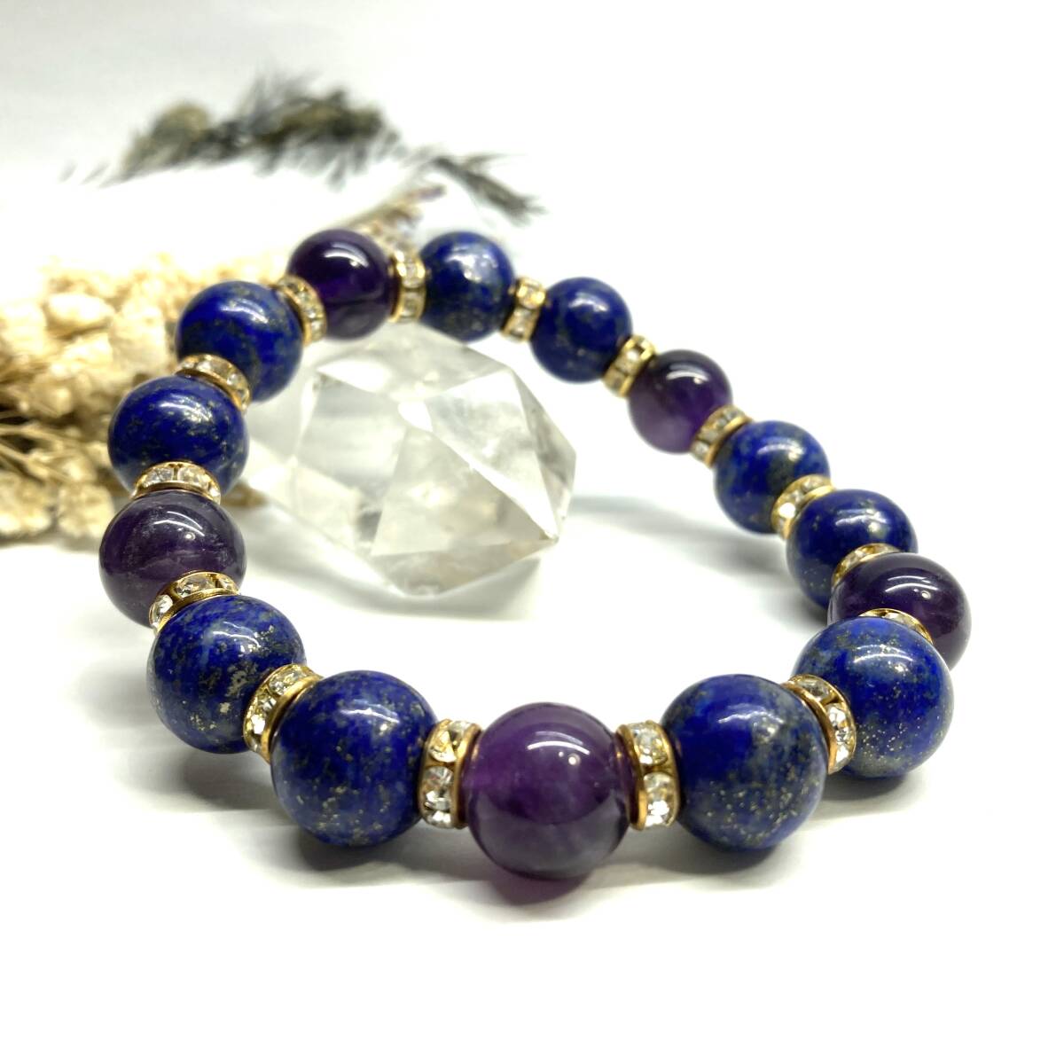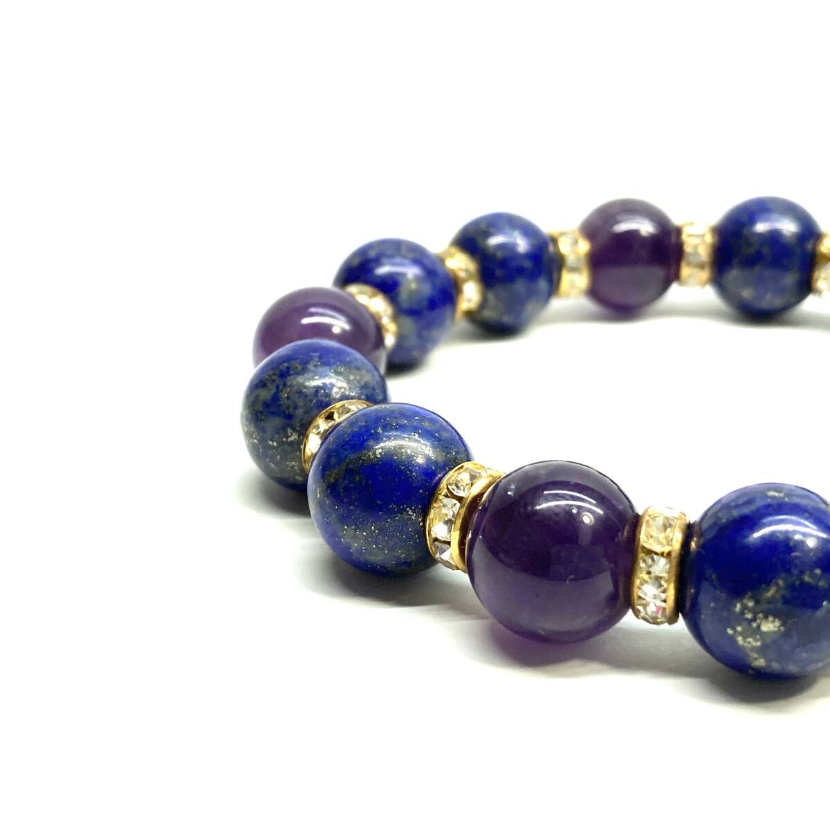 こちらは、ラピスラズリとアメジストを組み合わせたパワーストーンブレスレットです。間にはロンデルを挟み高級感あるデザインに仕上げております。程よくインパクトがある12mm玉を使用して内周約18cmです。(サイズ変更の場合は取引ナビにてご連絡をお願いします。) 数に限りがございますので気になる方はお早めにどうぞ。