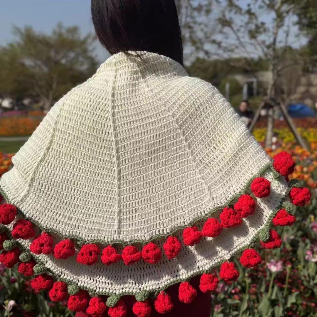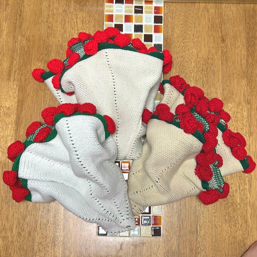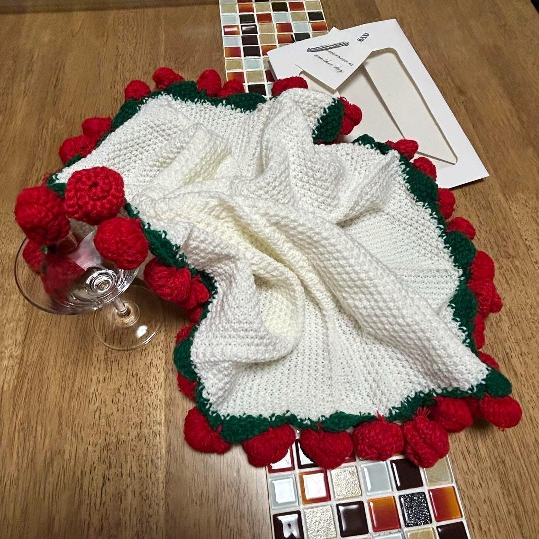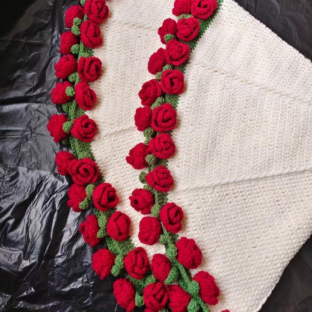 生成りの柔らかい白地に立体的な赤バラとグリーンの葉が華やかで、インテリアやひざ掛けの贈り物としても上品です。