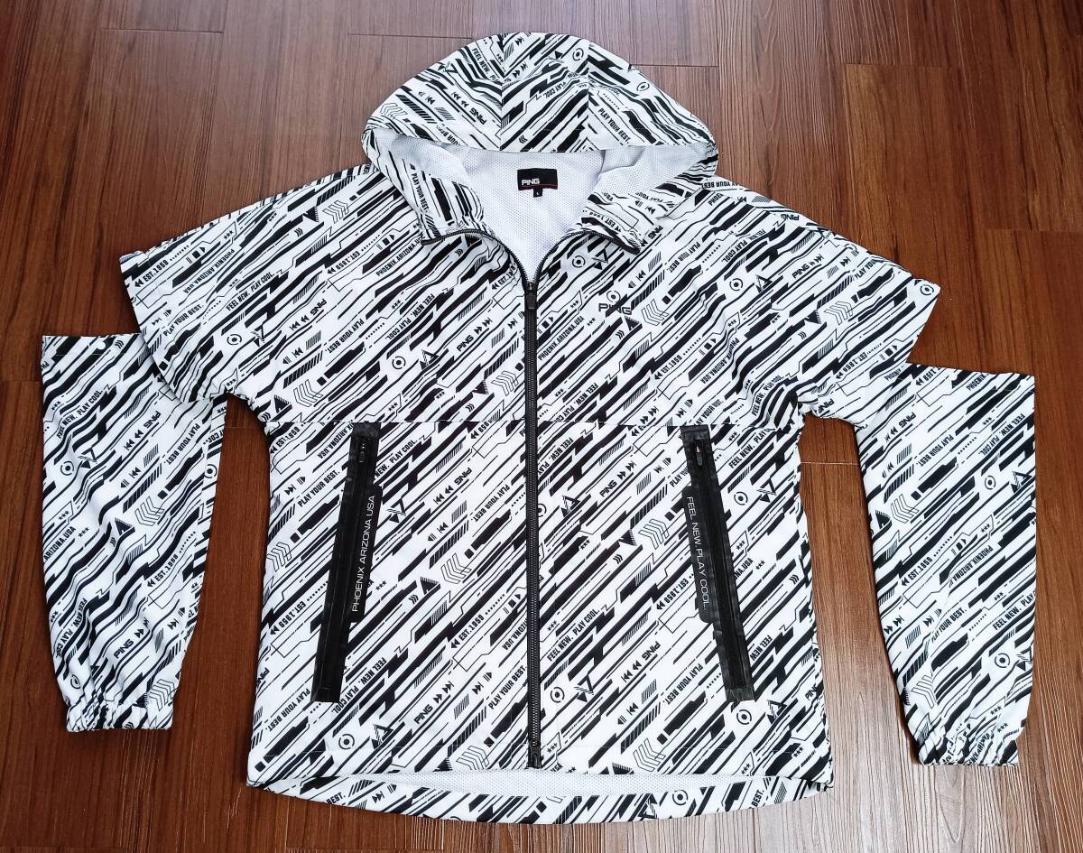 美品!大きめサイズ!PING ピン 長袖&半袖 2WAY切り替え バリアンストレッチ 総ロゴ 撥水 防風 防寒ジップアップジャケット(白×黒XL相当)