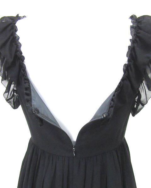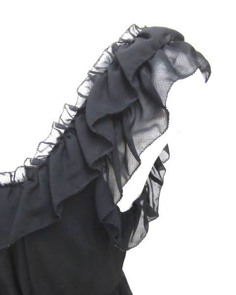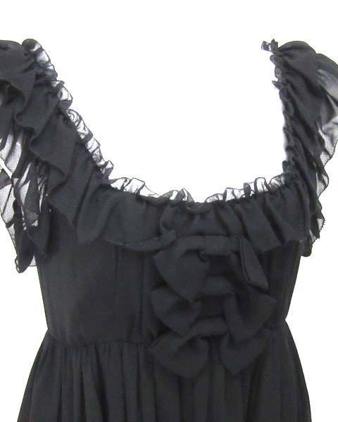 | シフォン生地のリボンやフリルの可愛いデザインのドレス。黒でシックでありながら華やかさがあります。ストールや華やかなアクセサリーでちょっとしたパーティーなどにおすすめです。 |
