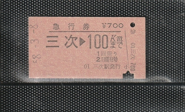 国鉄広島印刷 三次>100㎞ A型 赤地紋 硬券急行券 下パンチ券 料金700円