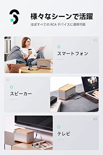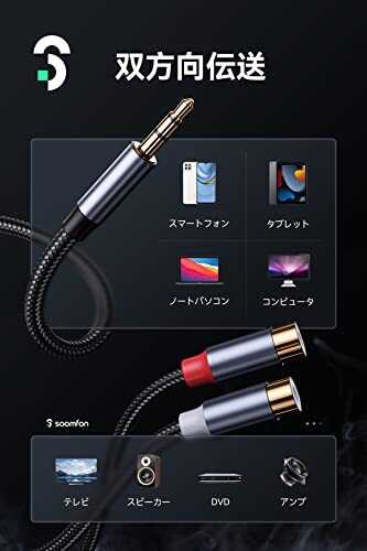 【幅広い互換性】スマホ、タブレット、PC、DVDなどの3.5mmジャクの音声をRCA赤白端子付きのアンプ、スピーカーに飛ばすオーディオ変換ケーブルです。3.5mm:スマートフォンやタブレット、MP3プレーヤー、CD プレーヤー、パソコン、車載AUX等に対応します。2RCA(赤/白):スピーカー、ステレオレシーバー、モニター、テレビ、アンプに対応します。