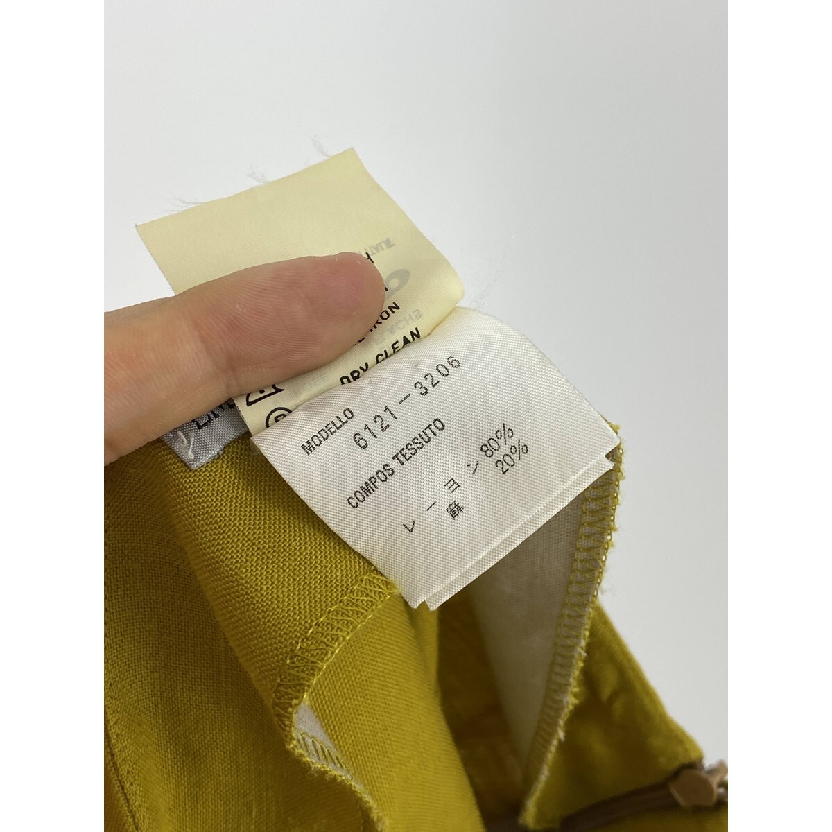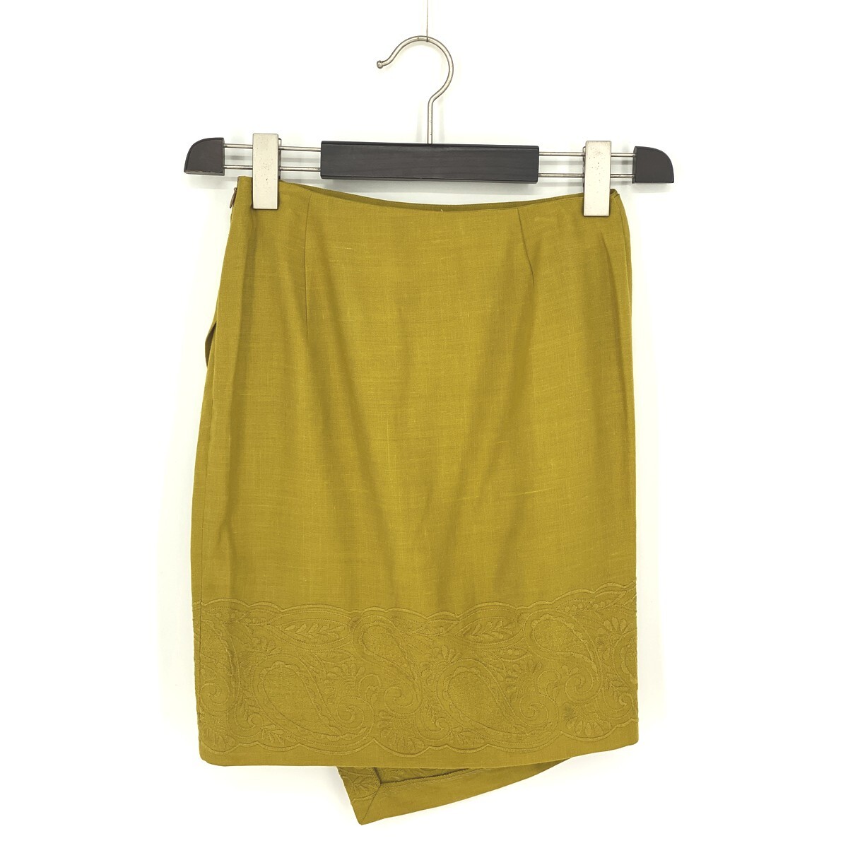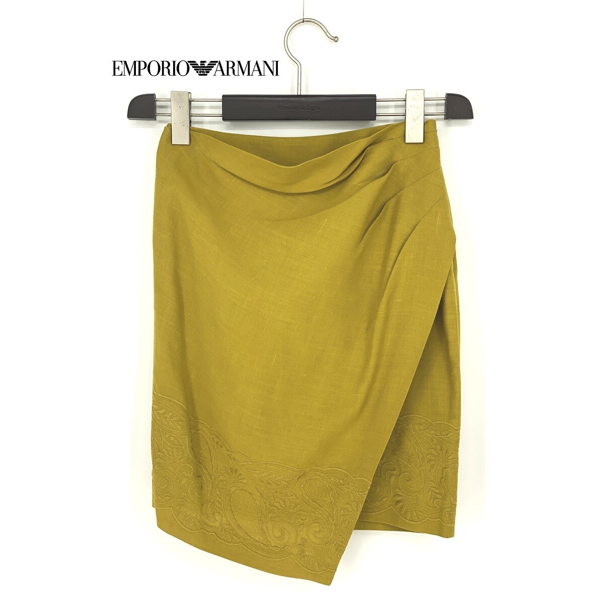 B0817/極美品 EMPORIO ARMANI エンポリオアルマーニ リネン 花刺繍 ボタニカル 変形 ギャザー 膝丈 巻きスカート風 38 M程 黄色 レディース