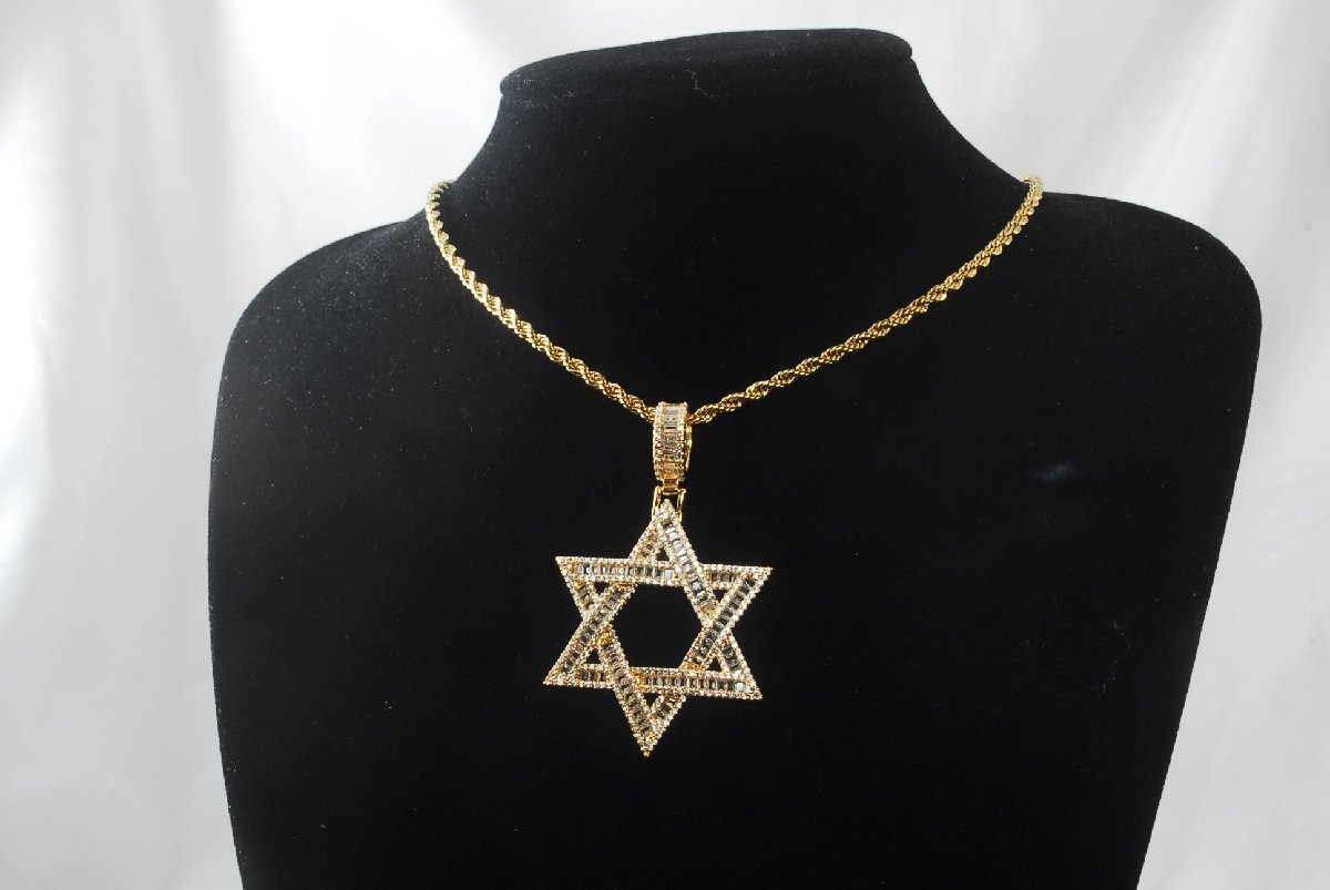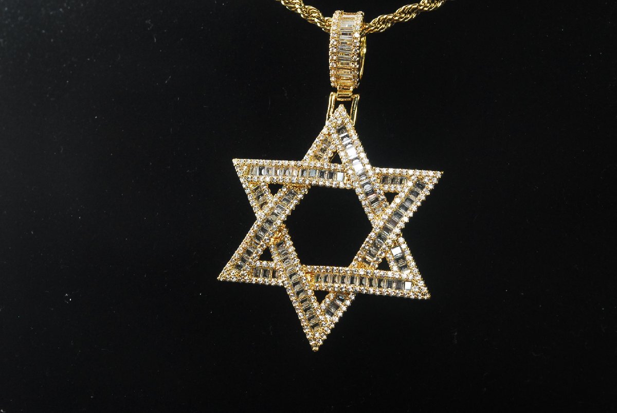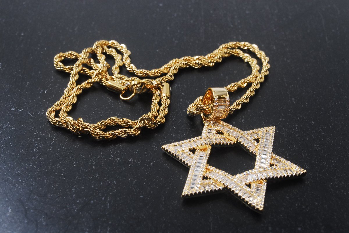 ・ジルコニアがキラキラと輝く六芒星、スター型の光輝く金の美しいネックレスです。