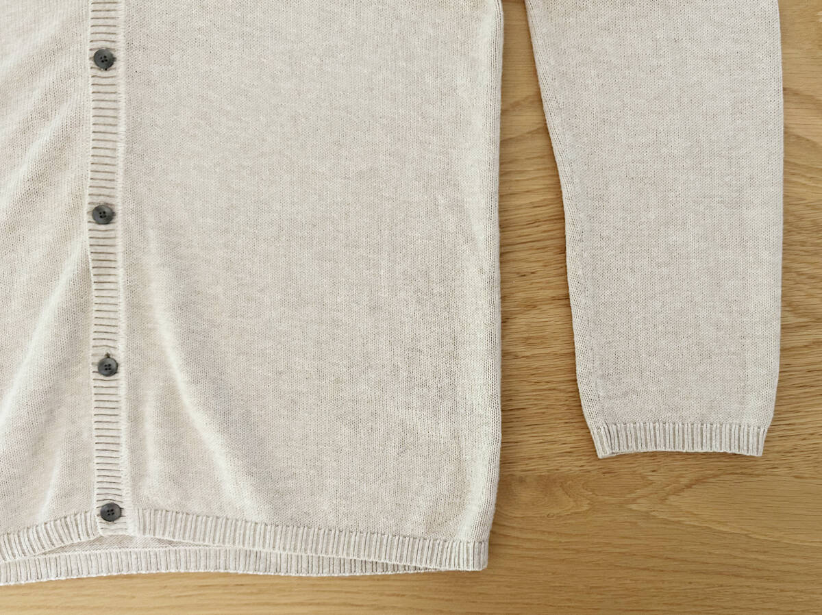 綿100%サラッとした手触りの生地、ショールカラーデザイン、ナチュラルな雰囲気のカーディガンです。