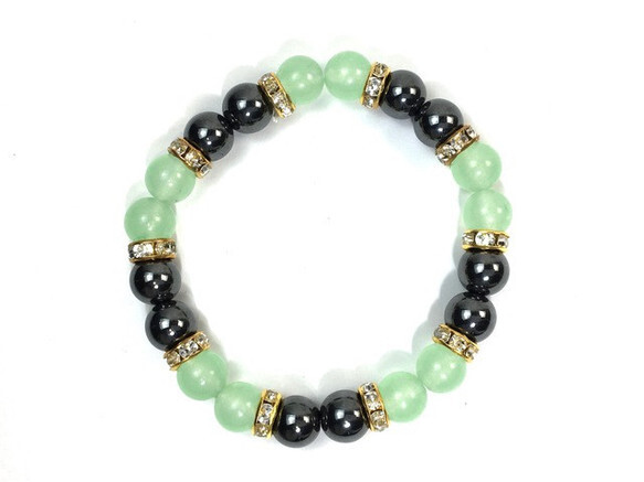 こちらは、8mm玉のジェイドとヘマタイトを使用したパワーストーンブレスレットです。間にはロンデルを挟み高級感ある大人っぽいデザインに仕上がっています。サイズは内周約15cmです。気になる方は是非この機会にどうぞ。。