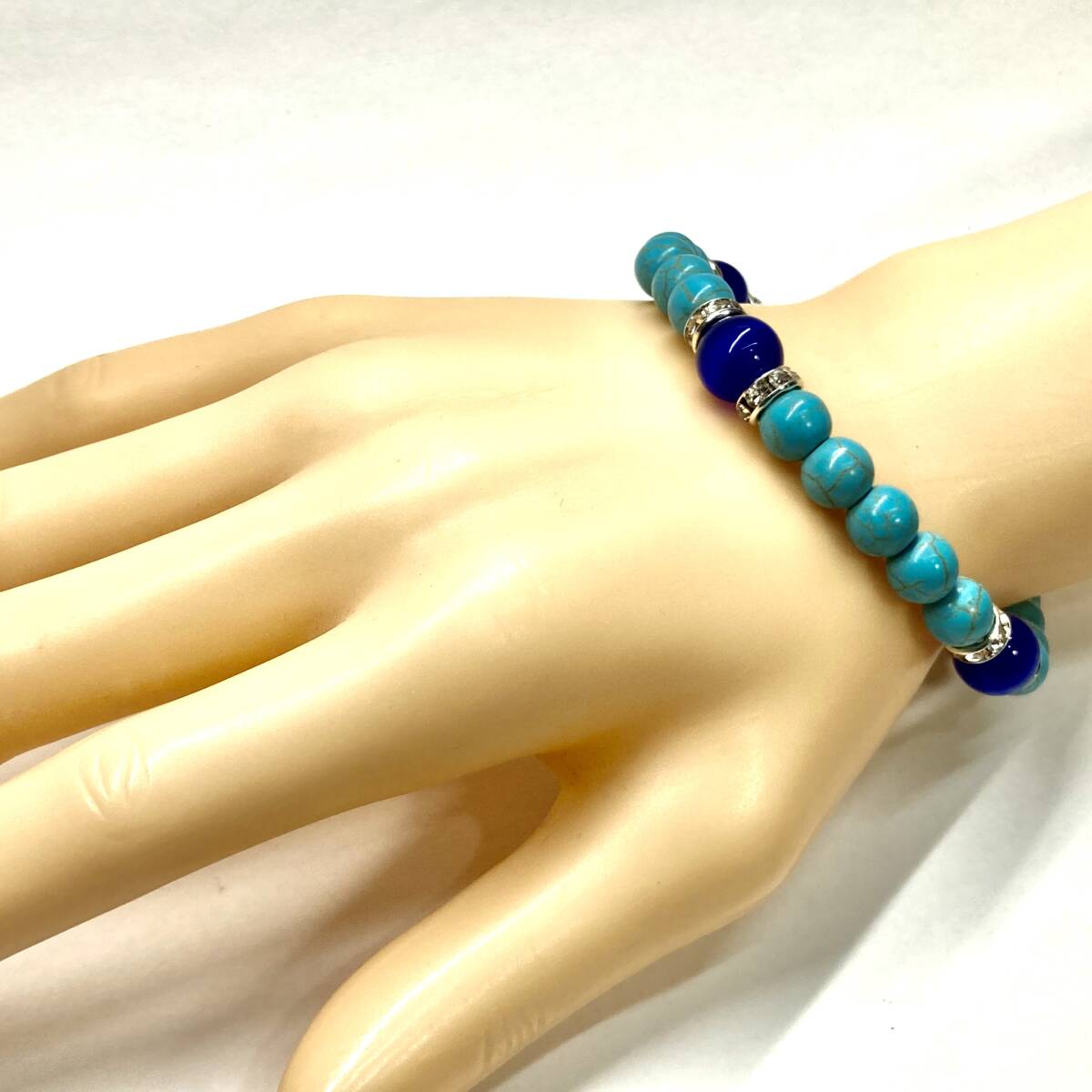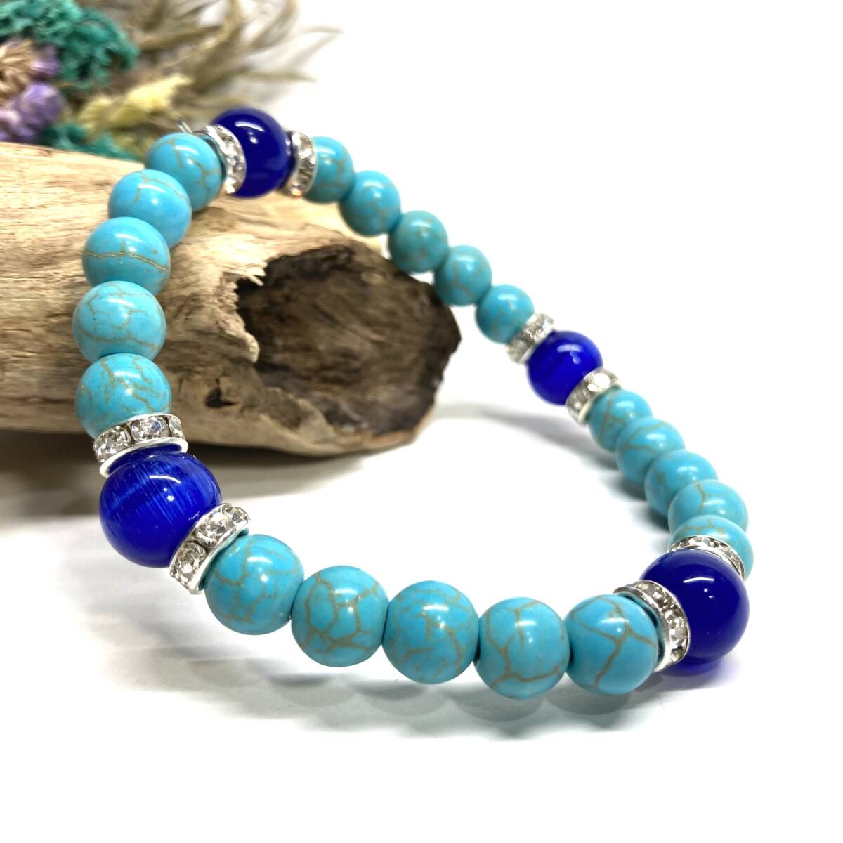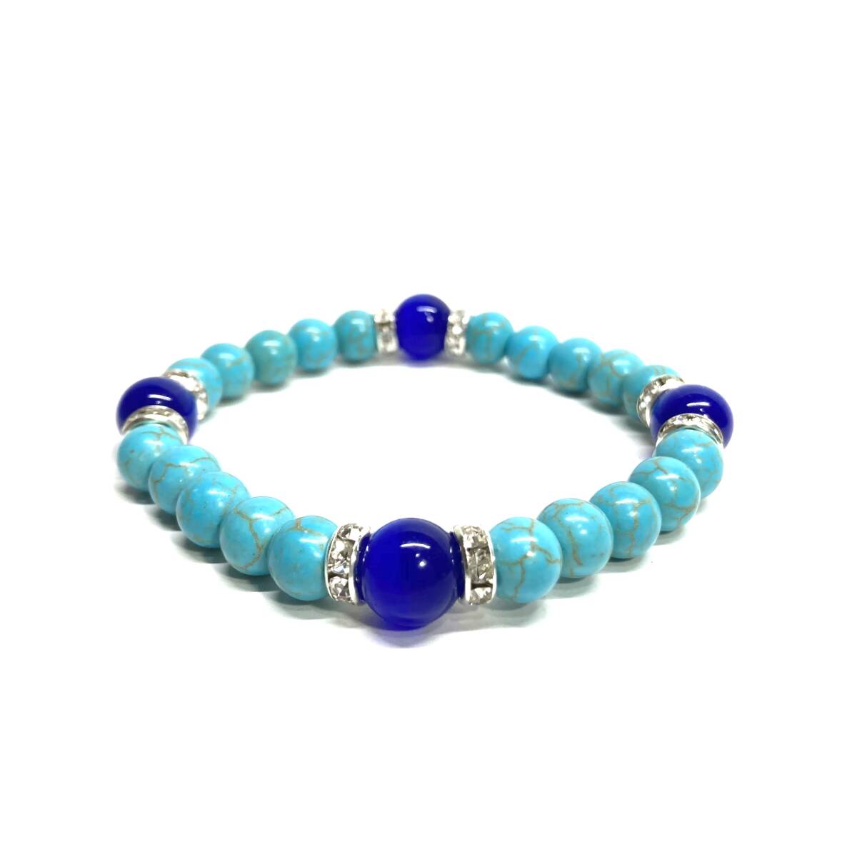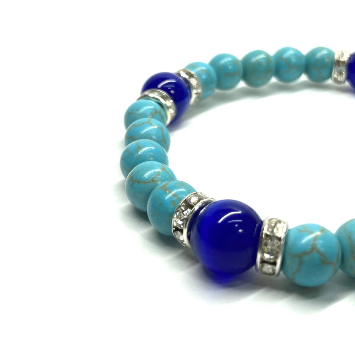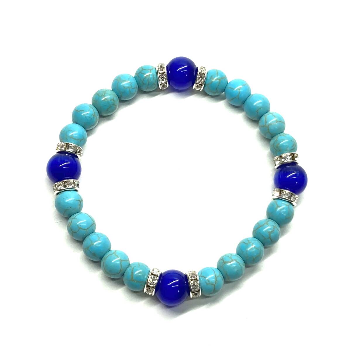 こちらは、8mm玉のキャッツアイとターコイズを使用したパワーストーンブレスレットです。間にはロンデルを挟み高級感ある大人っぽいデザインに仕上がっています。内周約17cmです。気になる方は是非この機会にどうぞ。