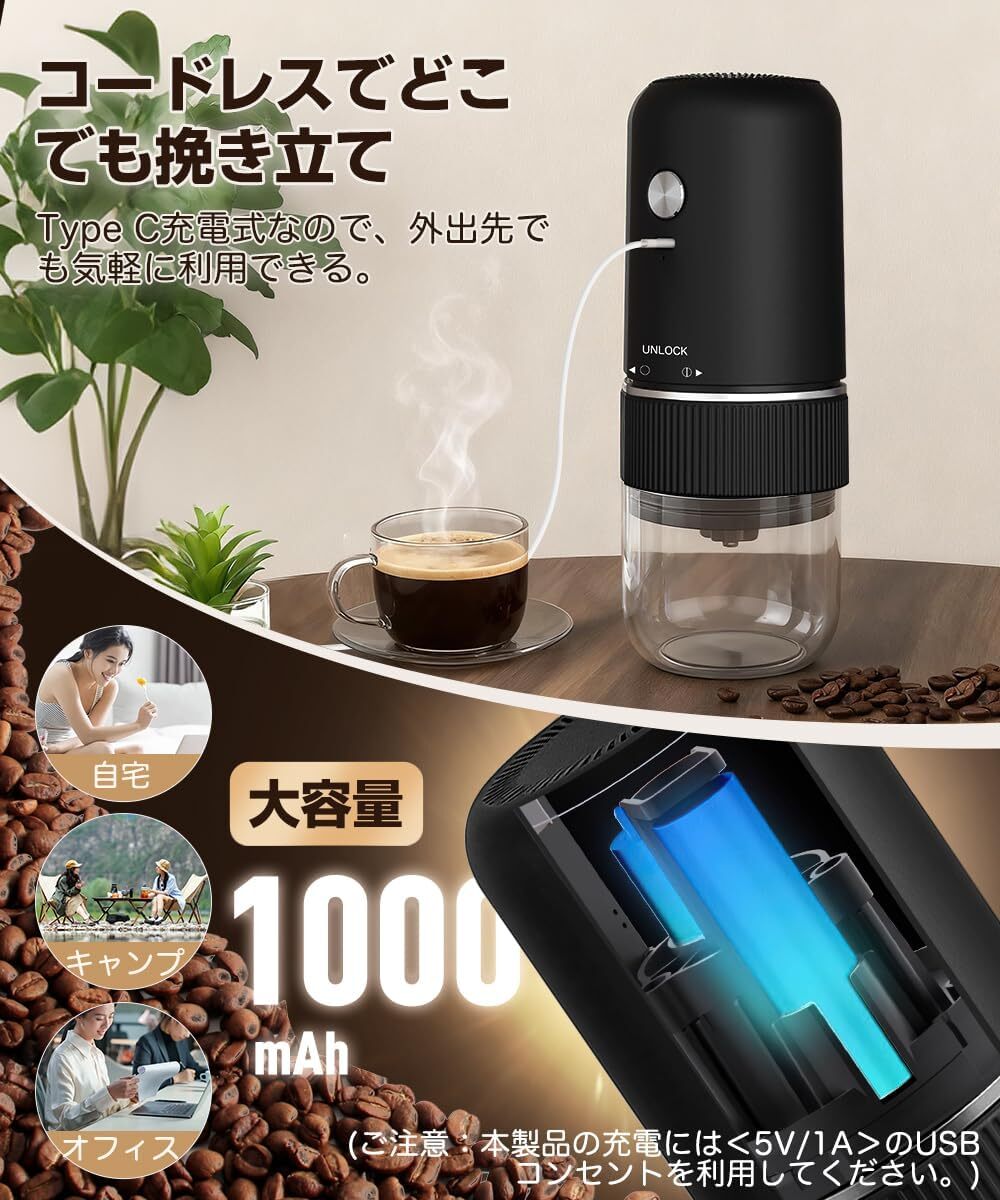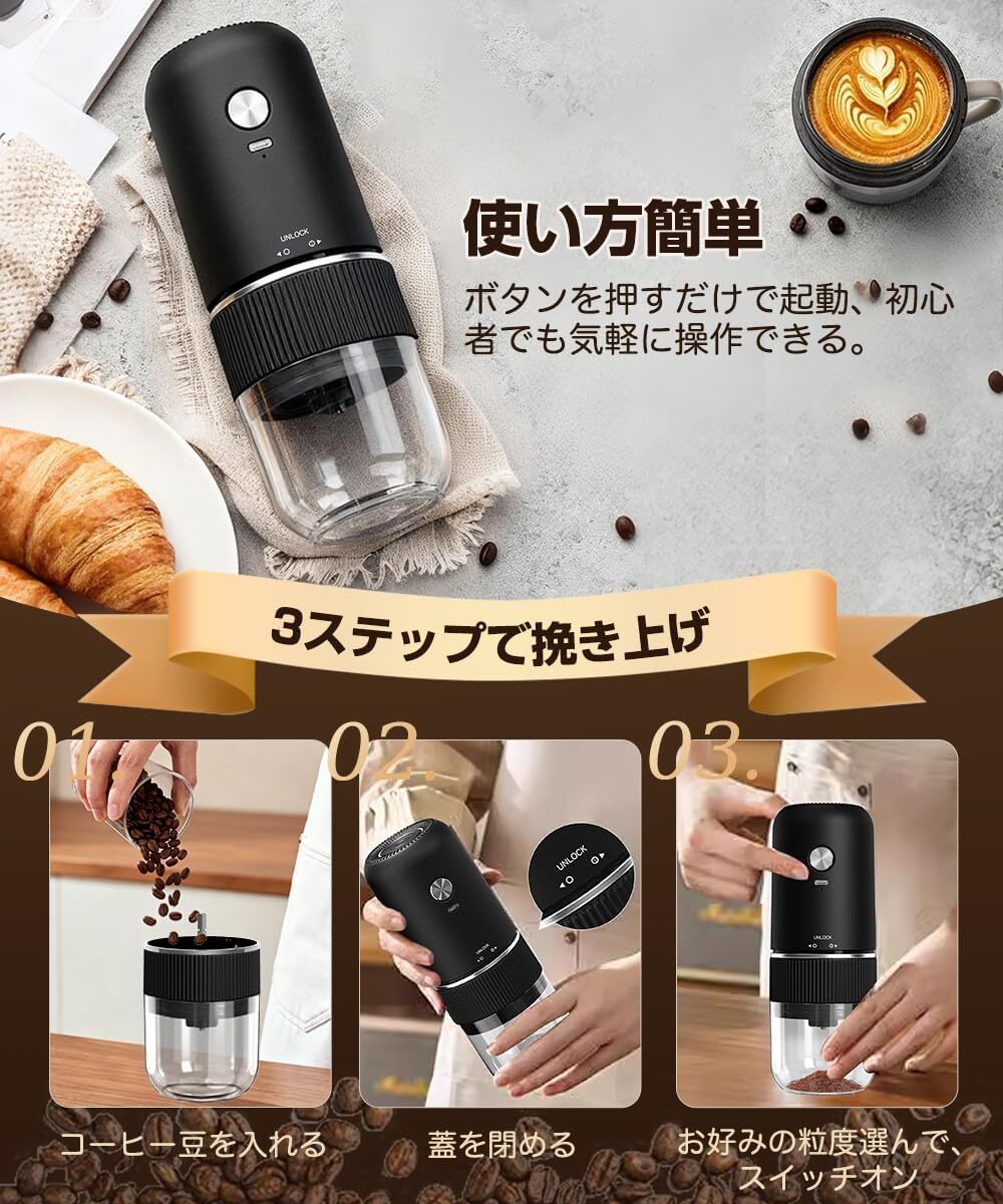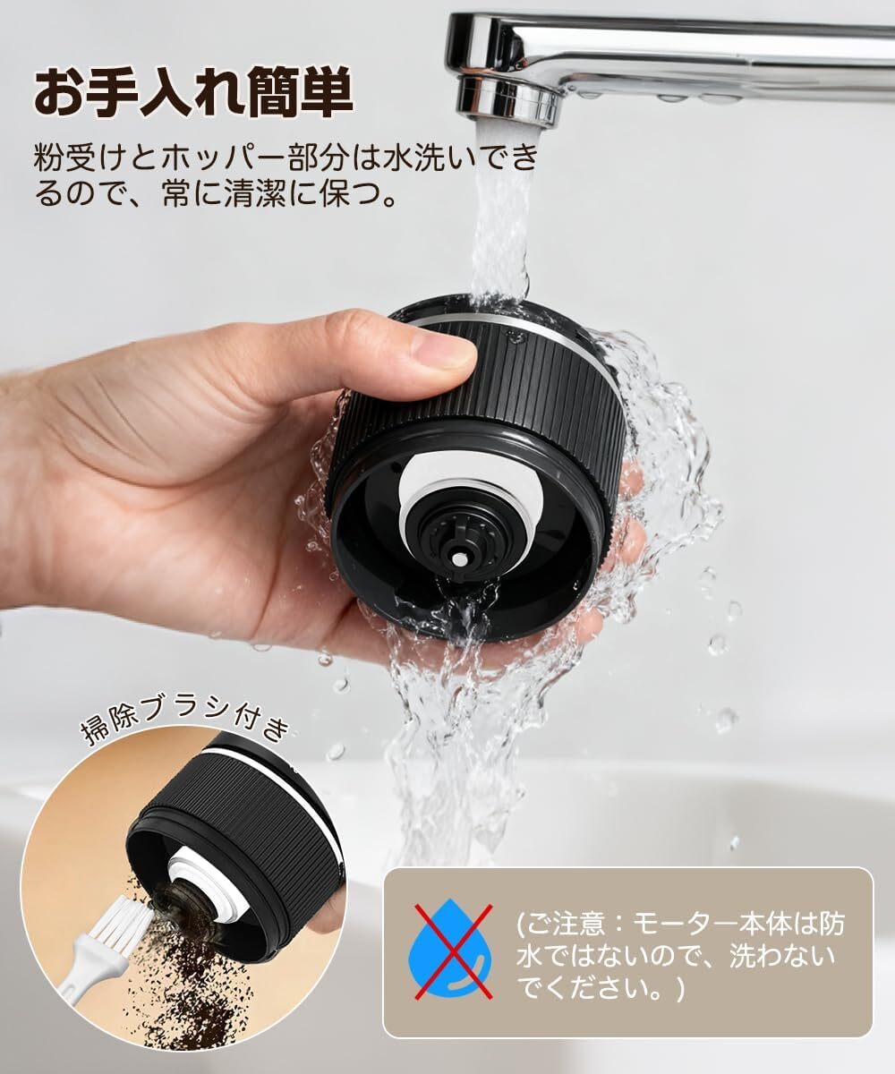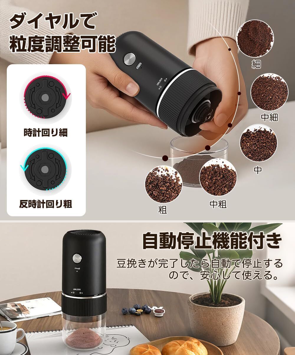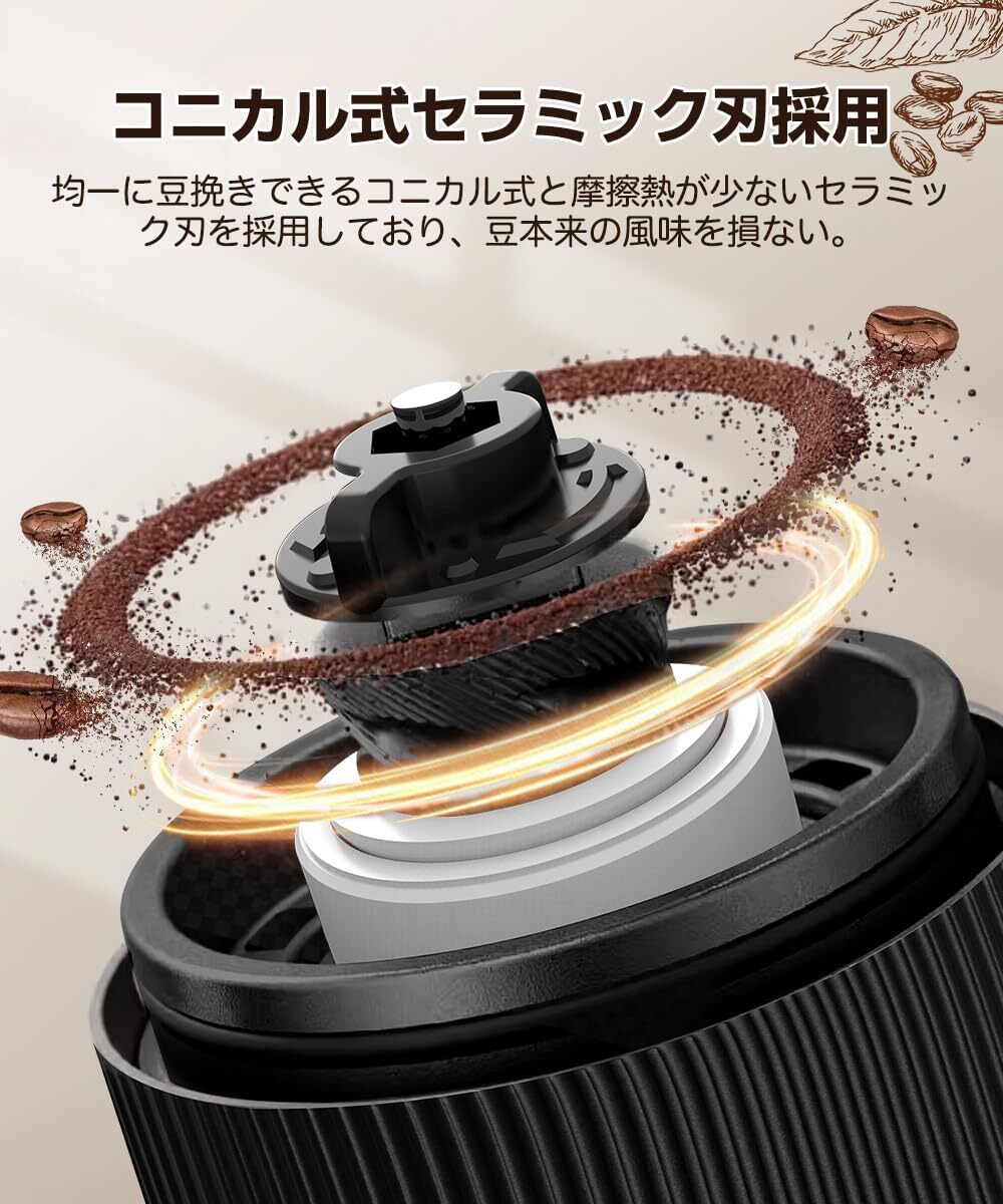 | 【手軽に2杯分&コニカル式セラミック刃採用】電動コーヒーミルは豆を入れて、ボタンを押すだけでコーヒー豆が挽けます。一度に最大25Gのコーヒー豆(約2杯分)を挽けます。忙しい朝やリラックスタイムにもぴったりです。また、電動コーヒーミルは均一に豆挽きできるコニカル式(臼式)、摩擦熱が少ないセラミック刃を採用しており、豆本来の香りや味わいが最大限に保存できます。これ一台あれば、忙しい朝でも、自宅で手軽に本格コーヒーが楽しめます。 【粒度調整可能&自動停止機能】コーヒーミル電動はダイヤルを回すだけでコーヒー豆の粒度調整が可能です。極細挽きから粗挽きまでお好みに合わせて自由に設定できます。エスプレッソ、ハンドドリップ、フレンチプレスなど、抽出方法に合わせて最適な挽き具合を選べます。また、コーヒーミル電動は自動停止機能が搭載され、豆挽きが完了したら自動で停止します。使用中が非常に安全安心です。 【Type C充電式&持ち運びやすい】コーヒーグラインダーはコードレスとType C充電式なので、電源が取れない場所でも気軽に利用できます。また、コーヒーグラインダーは7X7X21CMのコンパクトサイズで、重量も僅か412G、とても軽量で持ち運びやすいです。家、オフィス、出張、旅行など、様々な場合に大活躍しています。コーヒーグラインダーの静音設計により、家族や周りの人を気にせず、いつでもどこでも挽きたての香りを楽しむことができます。(ご注意:本製品の充電には<5V/1A>のUSBコンセントを利用してください。) 【操作簡単&お手入れ簡単】コーヒーミルはボタン1つのシンプルなデザインで、初心者からプロまで気軽に操作できます。ただ3ステップで簡単に研磨頂けます。①コーヒー豆をカップに入れます。②蓋を閉めます。③お好みの粒度を選んで、電源スイッチをオンにします。そして、コーヒーミルのお手入れも簡単で、粉受けとホッパー部分は水洗いできるので、常に清潔に保てます。(ご注意:モータ―本体は防水ではないので、洗わないでください。)また、専用の掃除ブラシが付属しており、製品の掃除が更に楽になります。 【パッケージの内容&】パッケージの内容:電動コーヒーミル、掃除ブラシ、Type C充電ケーブル、日本語取扱説明書。L48 |