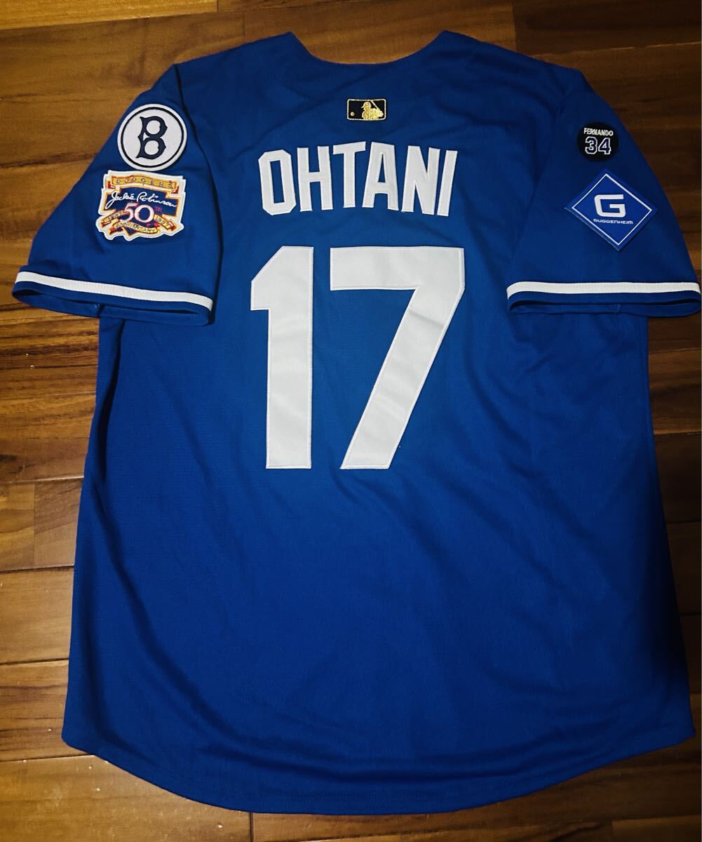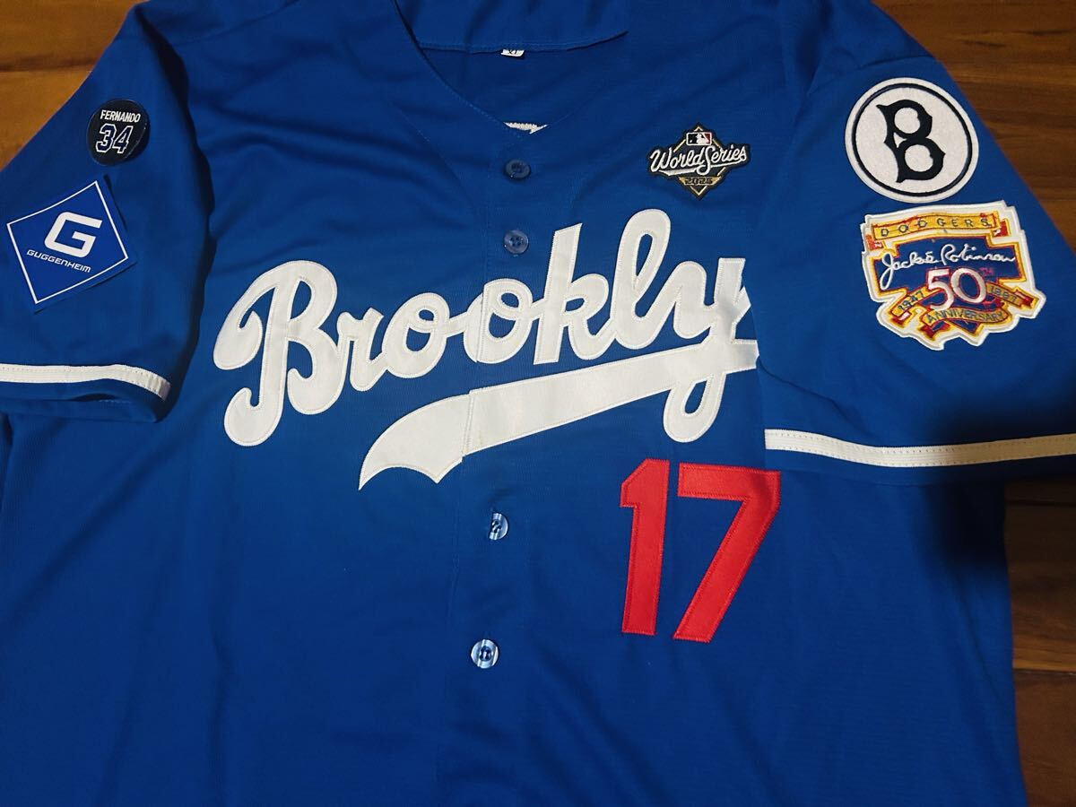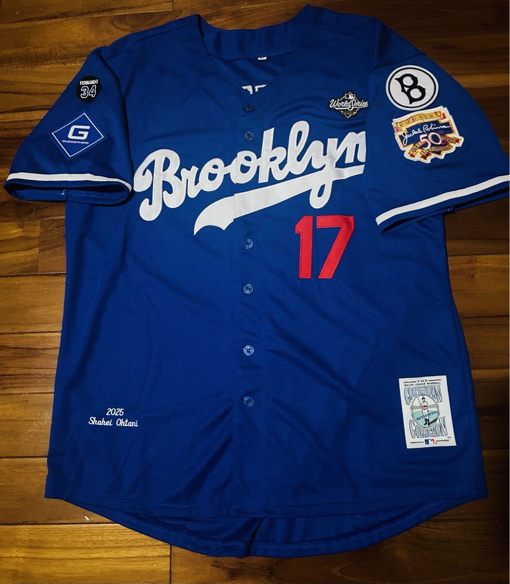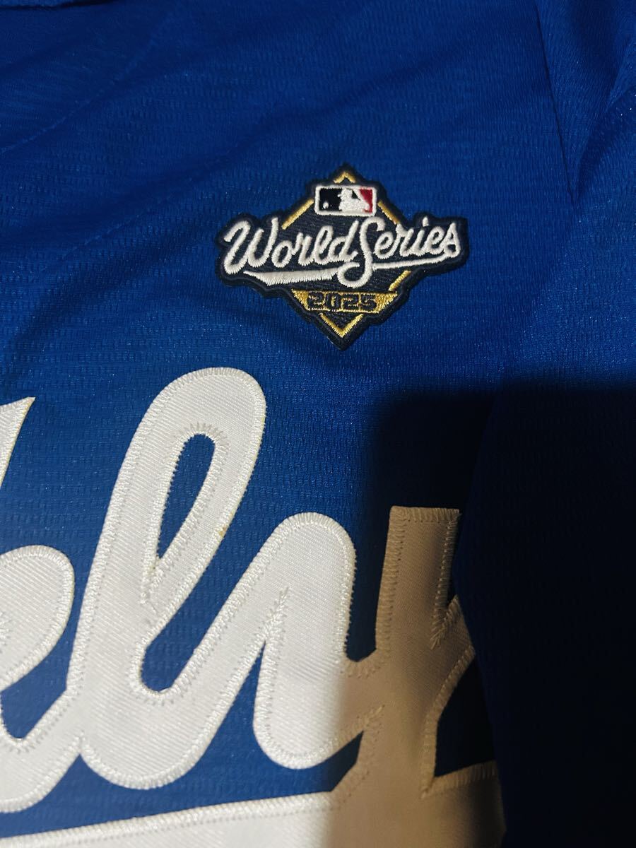 2025WSパッチ付き、腕にはジャッキー・ロビンソン50th記念、ブルックリン時代のロゴ、現状のドジャースのguggenheimとバレンズエラロゴ、後ろには2025限定ゴールドバッターマン仕様。レトロをモチーフにしたクーパーズタウンワッペン付き。