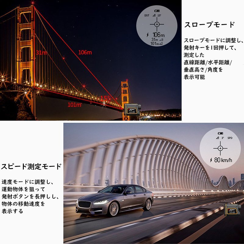 測定可能速度:0~300km/h 直線距離モード、スロープモード、ピンロックモード、スピード測定モード 単位:m(Meter),Yd(Yard)