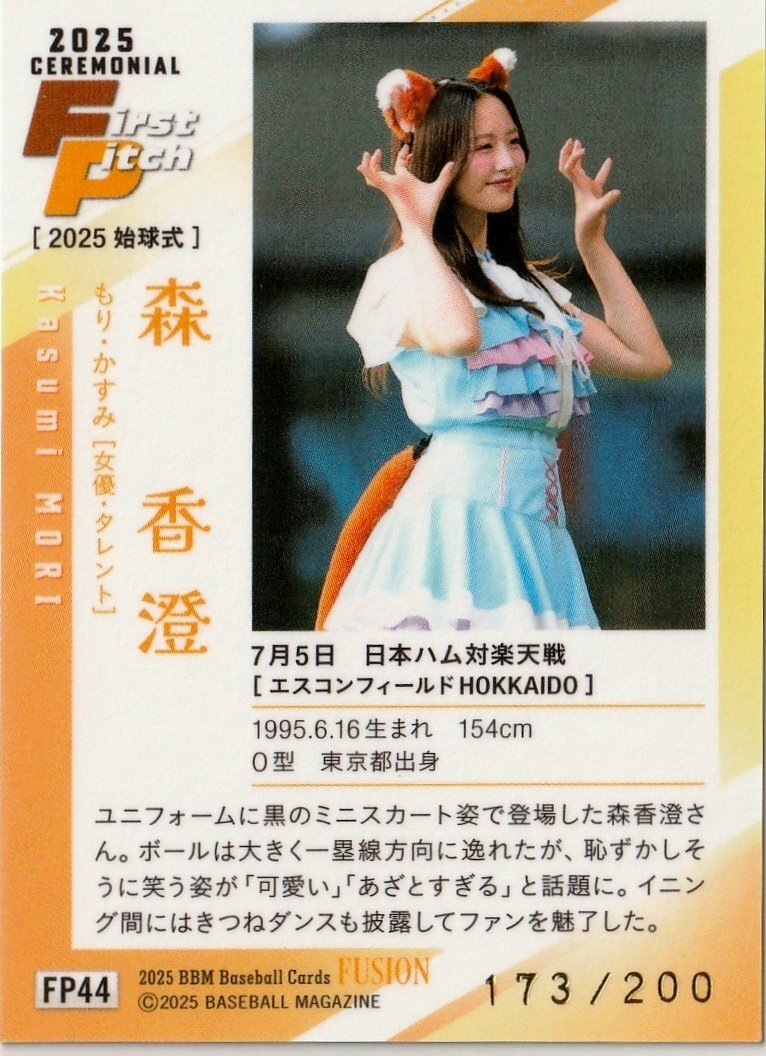200枚限定【FP44 森 香澄】200枚限定の銀紙版(始球式カード)2025 BBMベースボールカード FUSION
