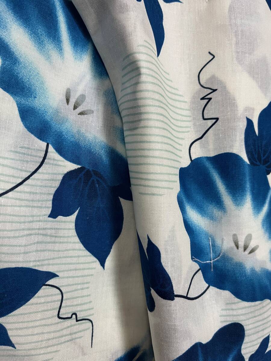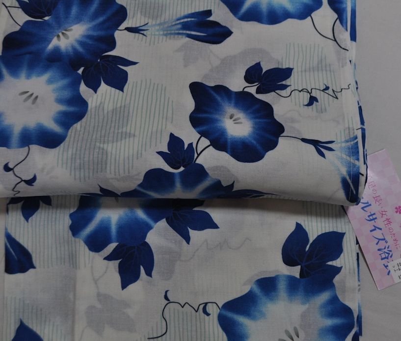 生地も綿ローン風でとてもさらりとしております お背が高い、手足が長い女性でもきれいなシルエットで着ることができる仕立上りの浴衣でございます。 通常サイズでは、おはしょりがでない、紐の位置を下げなければ着付けできないなど、着くずれやすい着こなししか出来ないというご心配はございません。 通常サイズより身丈は7〜8cm、裄丈は2〜3cm、長く仕立ててありますので、ゆとりを持ってお着付することができます。 白地に滲んだ感じのブルー系の朝顔 お背の高い海外の方へのプレゼントとしても喜ばれるサイズでございます 家族 お友達 パートナーとカタカタ下駄ならし 出かけましょう〜! |