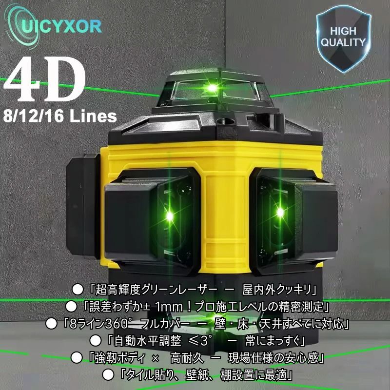 ● UICYXOR 4D・8ライン グリーンレーザーレベル 高精度 ±1mm/5m、明るいグリーンレーザー採用で屋内外を問わず視認性が高く、DIY〜プロ施工まで幅広く活用できるモデルです。 自動水平補正(3°)にも対応しており、傾いた際は警告ブザーでお知らせします。 ■ 特徴● 高輝度グリーンレーザー採用 屋外でも見やすく、施工ラインがはっきり確認できます。 ● 自動水平調整(セルフレベリング機能) 本体が3°以上傾くと自動補正、または警告。常に正確なラインを保持します。 ● 8ライン対応(360°水平 + 垂直ライン) 床・壁・天井の基準作り、タイル貼り、棚設置などに最適。 ● 高精度 ±1mm/5m 細かい施工やリフォーム現場でも安心して使用できます。 ● 耐久構造 しっかりした外装で日常使用にも耐える設計。 ■ 仕様(スペック表)・ブランド:UICYXOR ・モデル番号:SP57 ・タイプ:8ライン(グリーンビーム) ・波長:520nm ・精度:5m ±1mm ・自動補正範囲:3° ・サイズ:10 × 8 × 16 cm ・レーザー色:グリーン ・電源:リチウムバッテリー(付属) ・電子:対応 ・認証:CE ・付属品:レーザーレベル本体、バッテリー、充電ケーブル、収納ケース ■ 使用上の注意・レーザービームは目に向けないでください。 ・高温多湿の環境を避けて保管してください。 ・屋外直射日光下ではレーザーの見え方が弱まる場合があります。 |