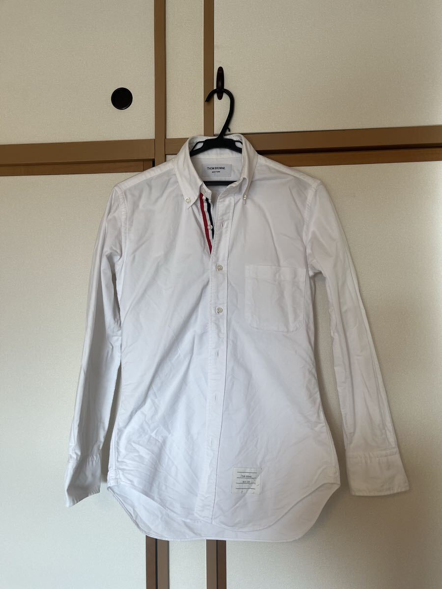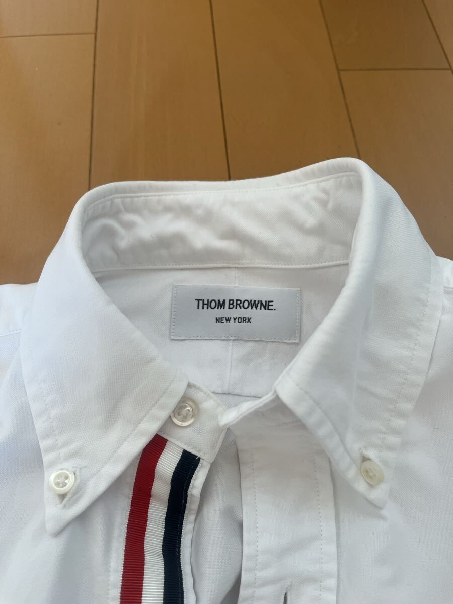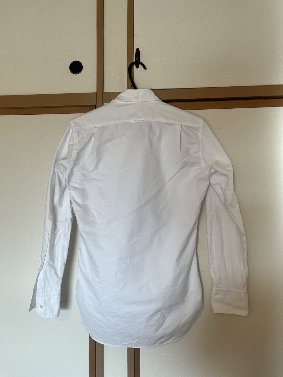 ホワイトのボタンダウンシャツ、トリコロールストライプのデザイン。